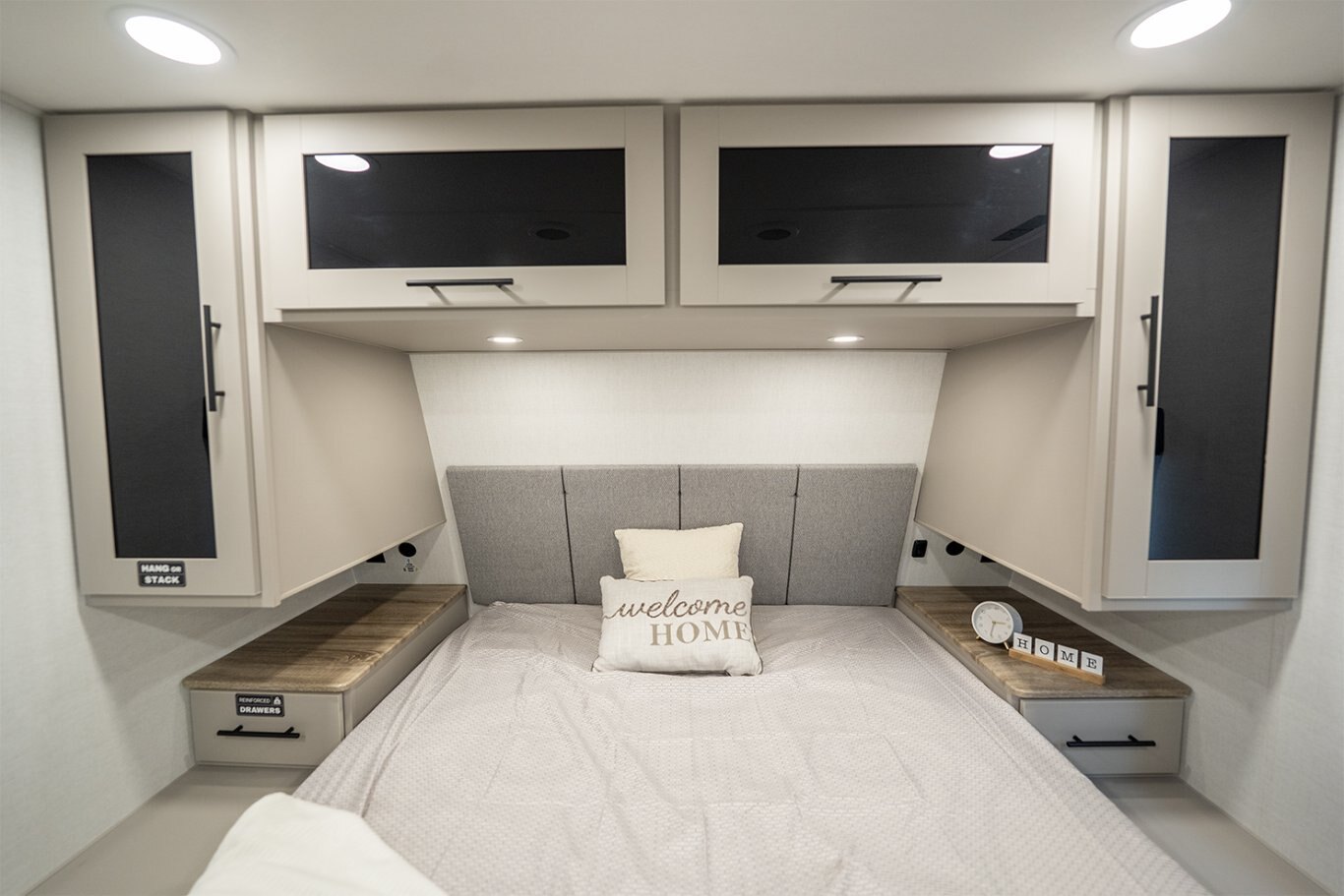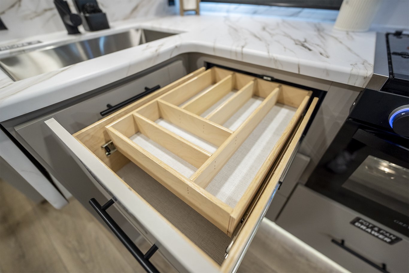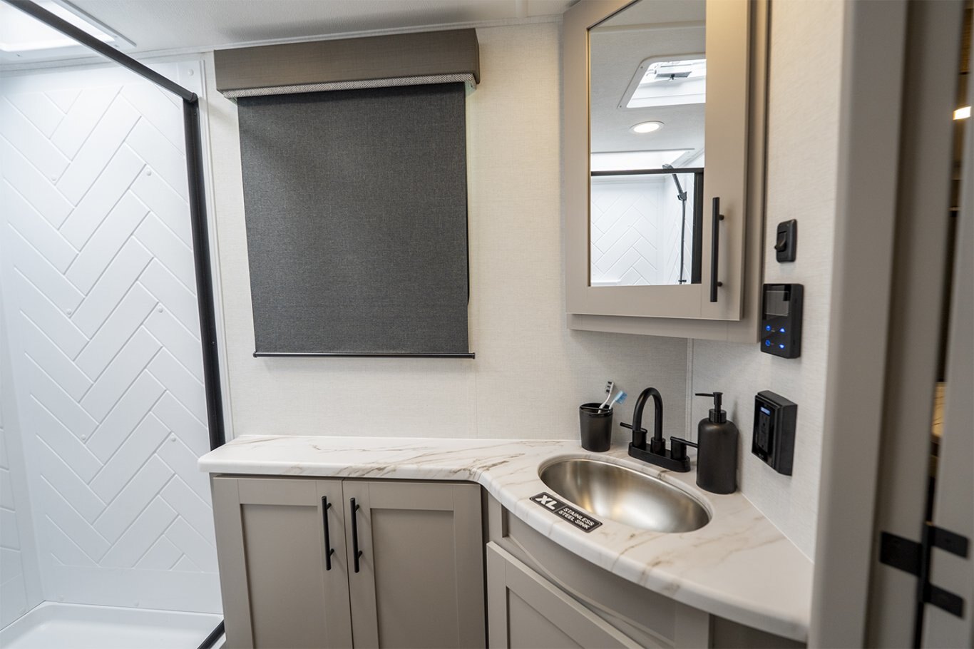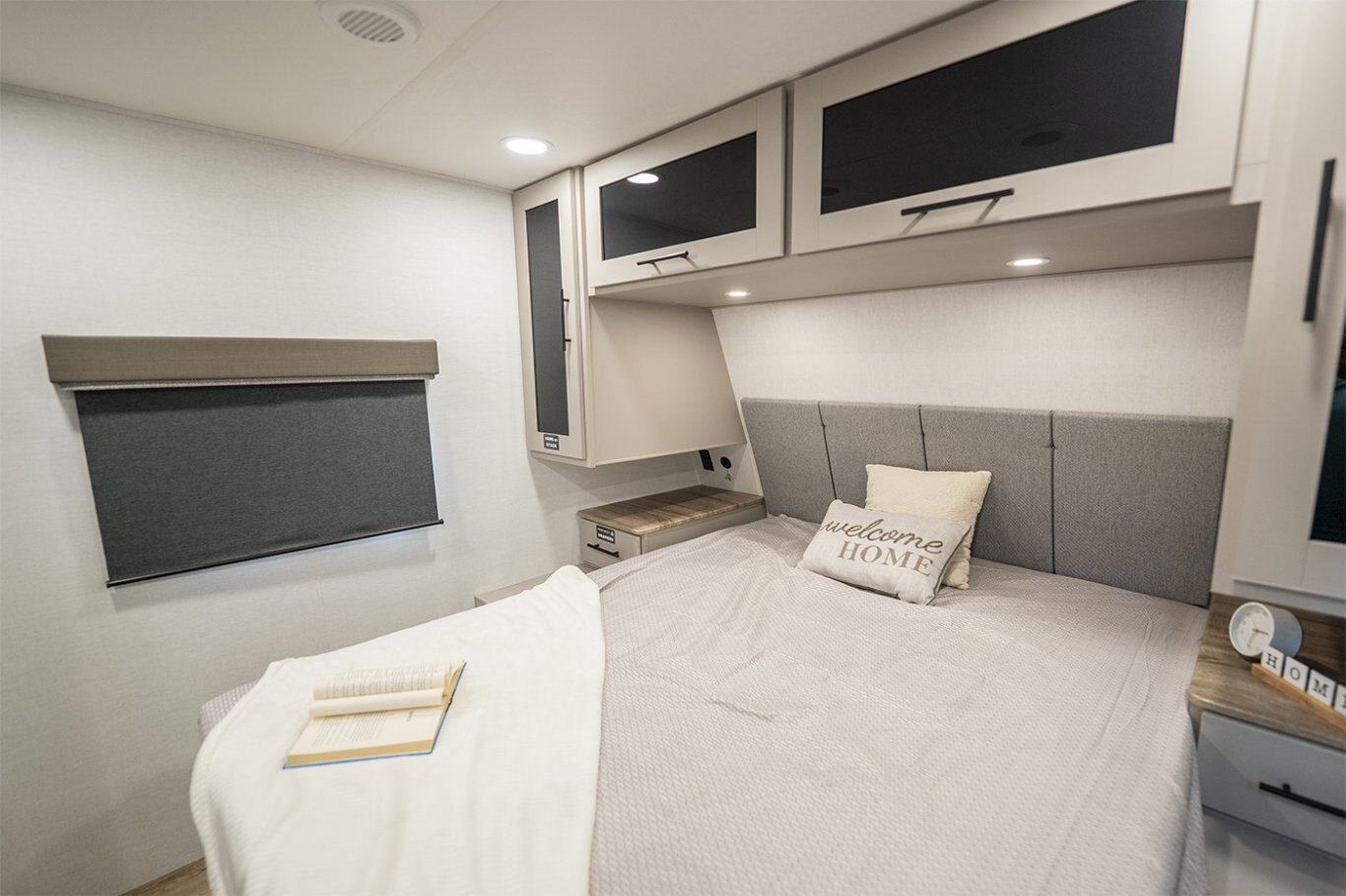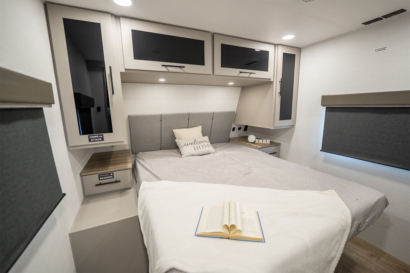 The well-appointed kitchen is equipped with solid surface countertops, a two-burner cooktop, convection microwave, residential refrigerator, and a deep-basin sink—delivering the convenience of home cooking no matter where you roam. A spacious rear corner bath includes a full-size shower and ample storage, making daily routines easy and efficient.