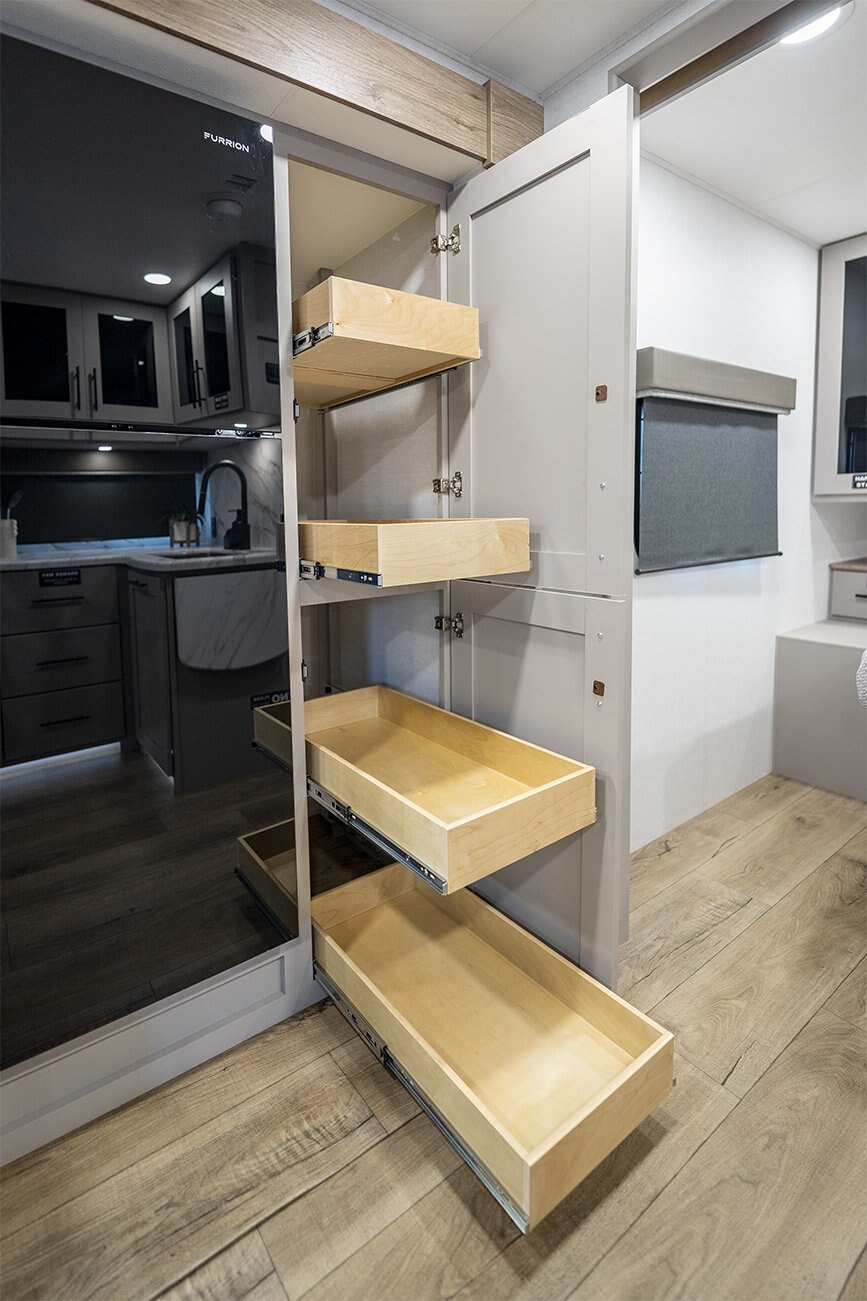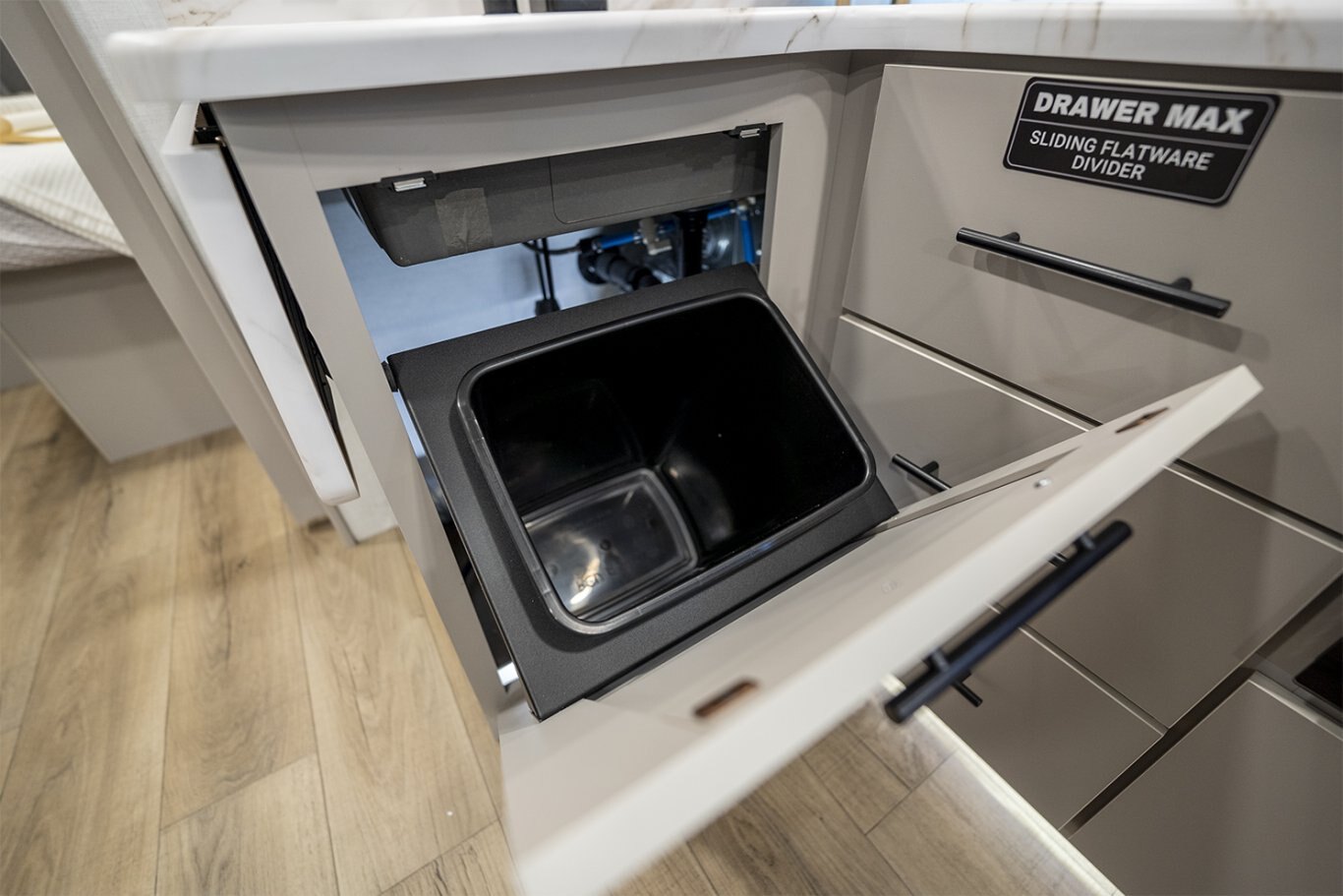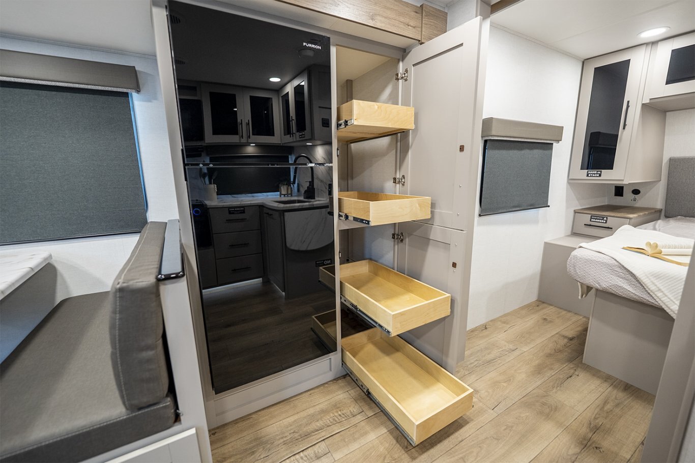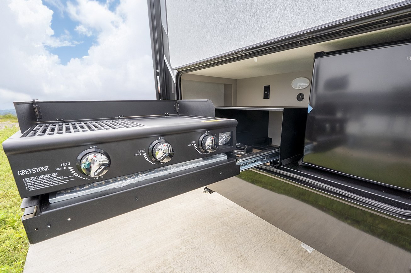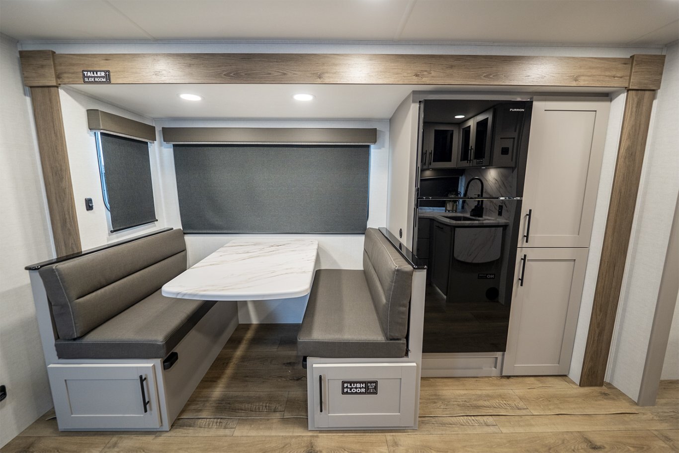 The well-appointed kitchen is equipped with solid surface countertops, a two-burner cooktop, convection microwave, residential refrigerator, and a deep-basin sink—delivering the convenience of home cooking no matter where you roam. A spacious rear corner bath includes a full-size shower and ample storage, making daily routines easy and efficient.