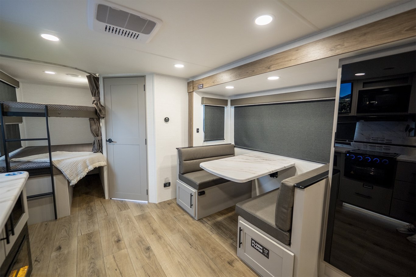 At just under 29 feet, the BH241 offers a versatile floorplan featuring double-over-double rear bunks, a front queen bedroom, and a U-shaped dinette that converts for additional sleeping space—comfortably sleeping up to eight. The private bedroom includes walk-around access, dual wardrobes, and overhead storage for a truly restful retreat.