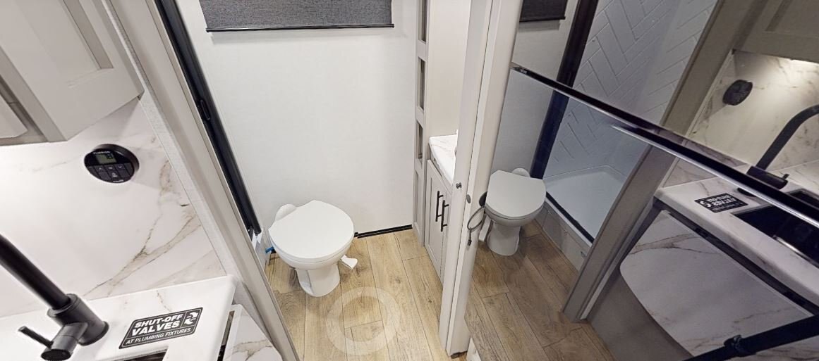 • Soft close porcelain toilet with foot flush
