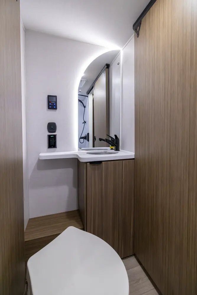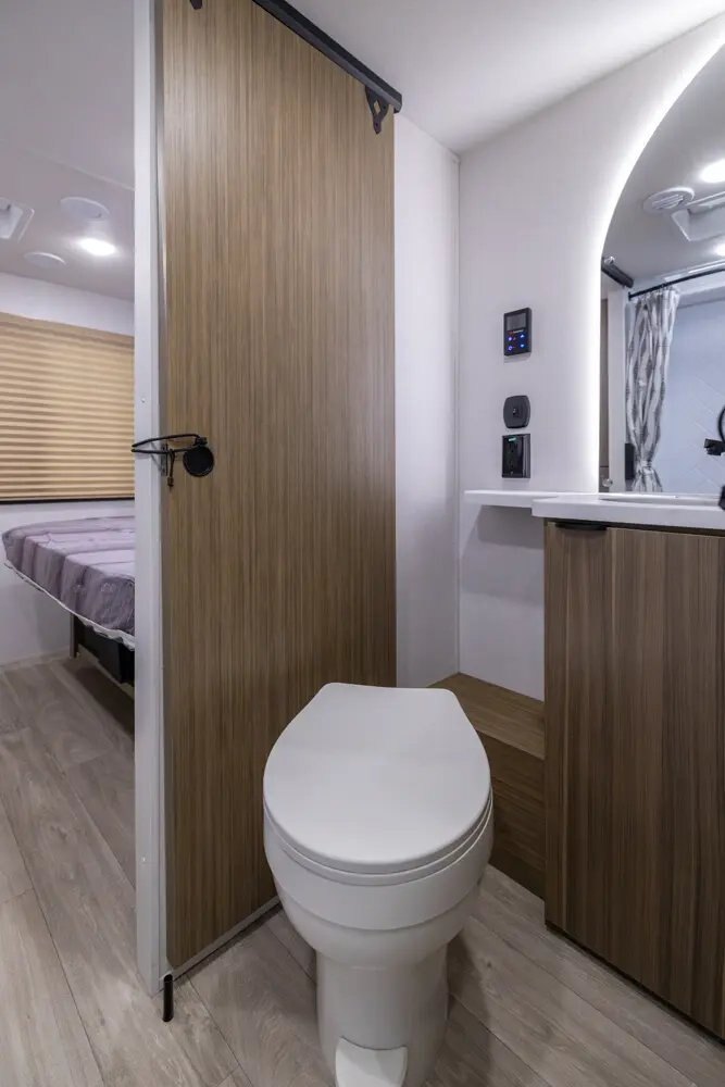 Camp Comfort Package Outside Hot/Cold Shower Slim Range Vent Hood over Cooktop Residue Resistant Linoleum (Added Durability Against Oil, Grease, Gas) Foot Flush Toilet Power Vent Fans to Exhaust Heat, Smells, and Humidity LED Interior Lighting for Low Power Draw and Brighter Camping LP Quick Connect on Exterior of Unit - Perfect for Griddles, Grills, and More
