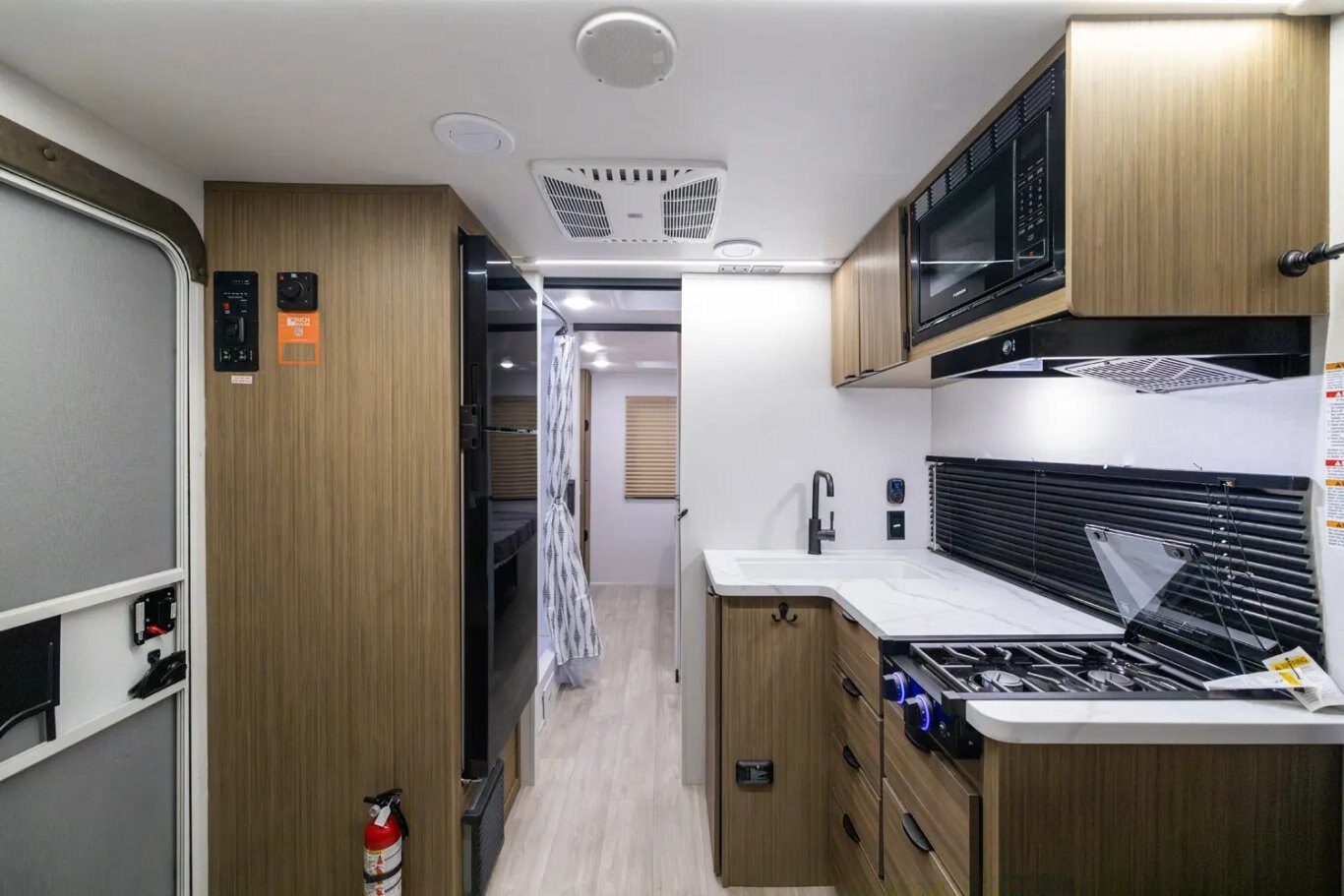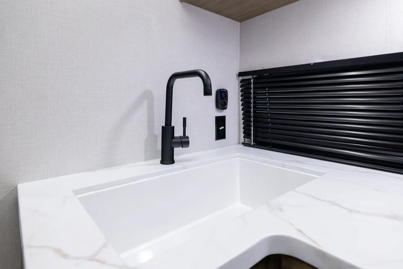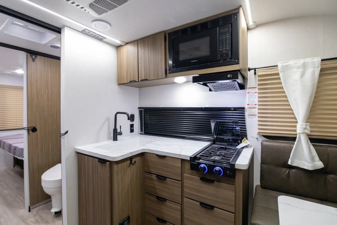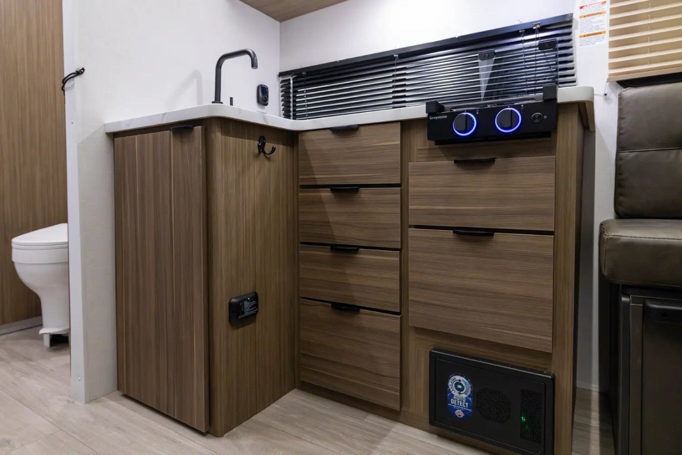 Kitchen Standard Features MAX Kitchen Storage - Nearly 50% More Cabinetry Than Others Thanks to Space Saving Appliances and Clever Designs 3-in-1 Cooker w/ Convection Oven, Microwave, 3 Burner Gas Cooktop 10CuFt 12V Refrigerator for Extended Camping Residential High Rise Kitchen Faucet and Deep Kitchen Sink Slim Range Vent Hood over Cooktop (Varies by Model) Seamless Countertops with Waterproof Membrane for Longevity