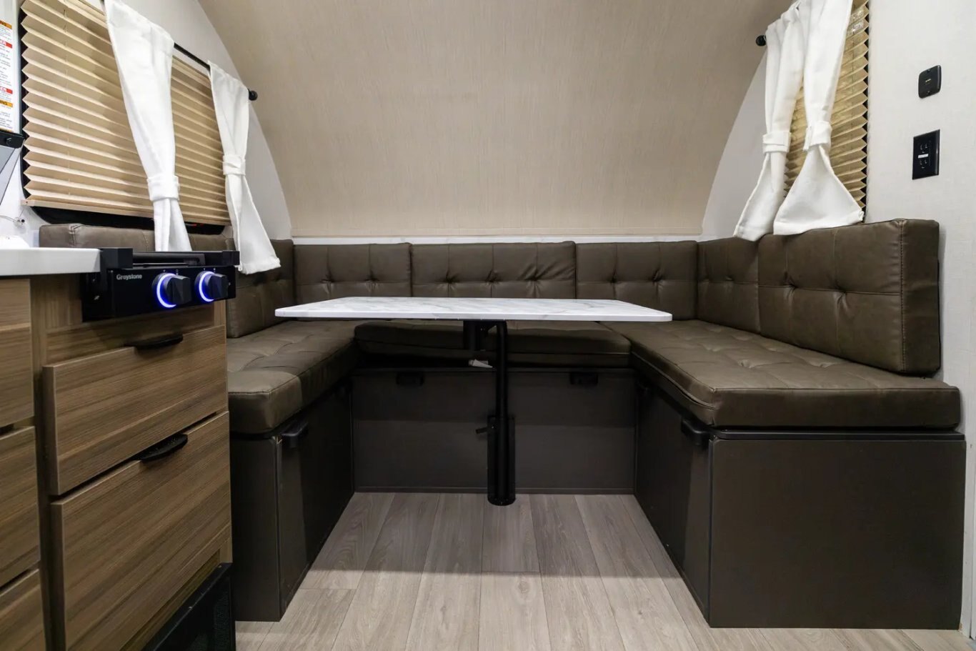 Limited Edition Camp Ready Package: Lite Weight Towing Approved 6 Gallon DSI Gas Water Heater Backup Camera Prep Power Roof Vents Sofa Seating In Place of Dinette 5/8" Tongue and Groove Flooring Carpet Free with One Piece Linoleum Powder Coated I-Beam Chassis for Longevity Dual Deep Cycle Battery Capable Holding Tray Single 20# LP Bottle
