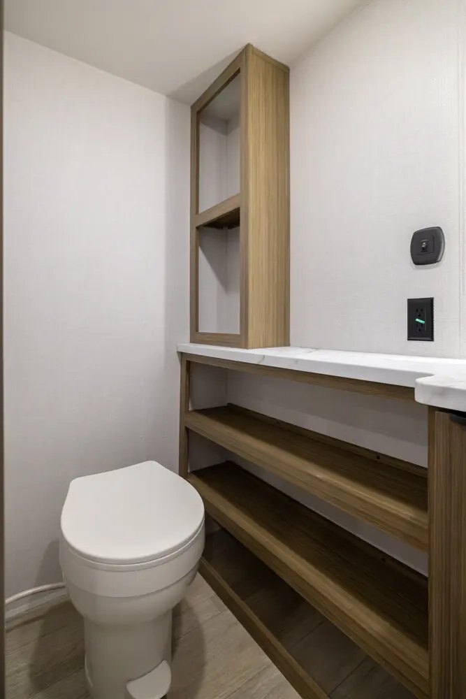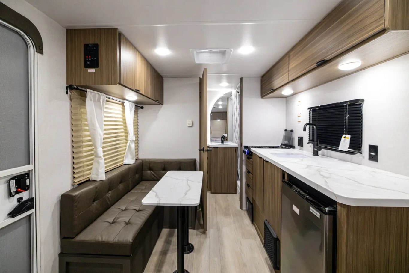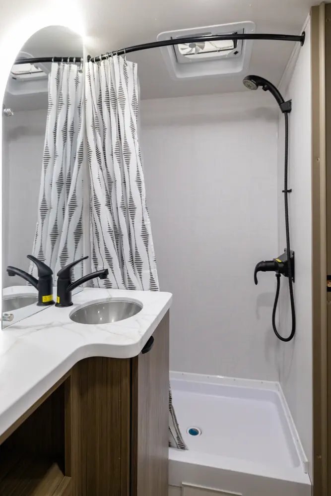 Camp Comfort Package Outside Hot/Cold Shower Slim Range Vent Hood over Cooktop Residue Resistant Linoleum (Added Durability Against Oil, Grease, Gas) Foot Flush Toilet Power Vent Fans to Exhaust Heat, Smells, and Humidity LED Interior Lighting for Low Power Draw and Brighter Camping LP Quick Connect on Exterior of Unit - Perfect for Griddles, Grills, and More