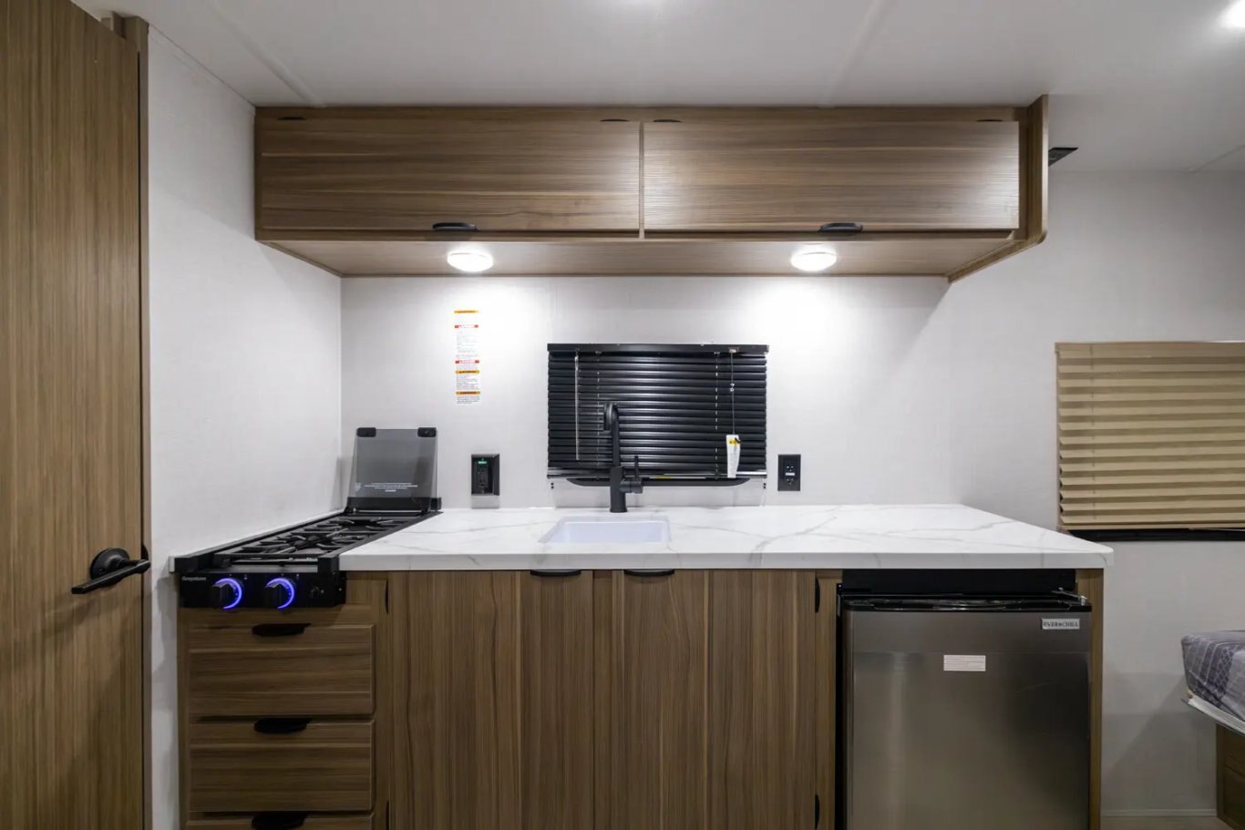 Kitchen Standard Features MAX Kitchen Storage - Nearly 50% More Cabinetry Than Others Thanks to Space Saving Appliances and Clever Designs 3-in-1 Cooker w/ Convection Oven, Microwave, 3 Burner Gas Cooktop 10CuFt 12V Refrigerator for Extended Camping Residential High Rise Kitchen Faucet and Deep Kitchen Sink Slim Range Vent Hood over Cooktop (Varies by Model) Seamless Countertops with Waterproof Membrane for Longevity