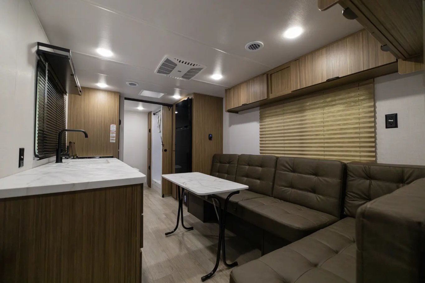 Limited Edition Camp Ready Package: Lite Weight Towing Approved 6 Gallon DSI Gas Water Heater Backup Camera Prep Power Roof Vents Sofa Seating In Place of Dinette 5/8" Tongue and Groove Flooring Carpet Free with One Piece Linoleum Powder Coated I-Beam Chassis for Longevity Dual Deep Cycle Battery Capable Holding Tray Single 20# LP Bottle