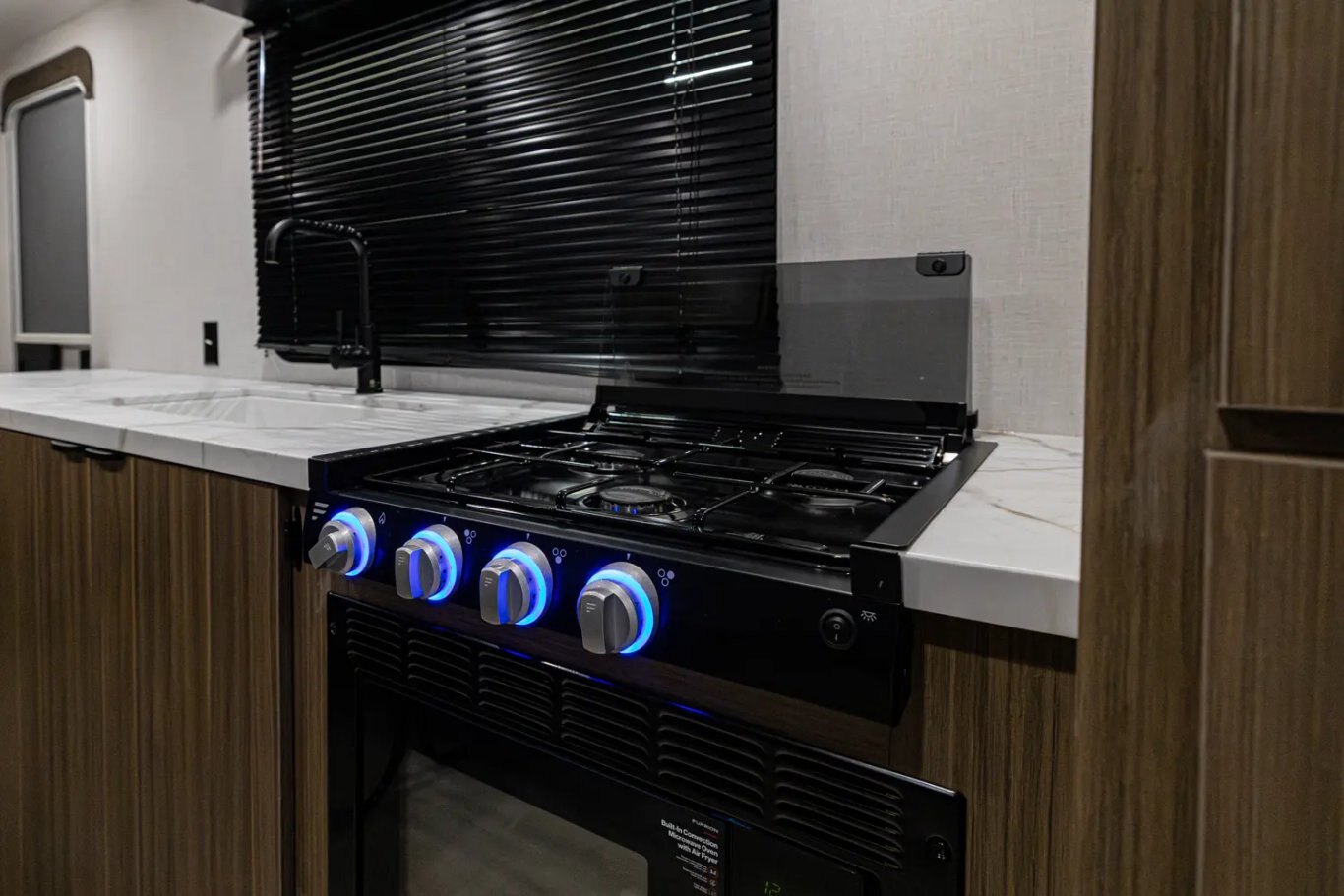 Kitchen Standard Features MAX Kitchen Storage - Nearly 50% More Cabinetry Than Others Thanks to Space Saving Appliances and Clever Designs 3-in-1 Cooker w/ Convection Oven, Microwave, 3 Burner Gas Cooktop 10CuFt 12V Refrigerator for Extended Camping Residential High Rise Kitchen Faucet and Deep Kitchen Sink Slim Range Vent Hood over Cooktop (Varies by Model) Seamless Countertops with Waterproof Membrane for Longevity