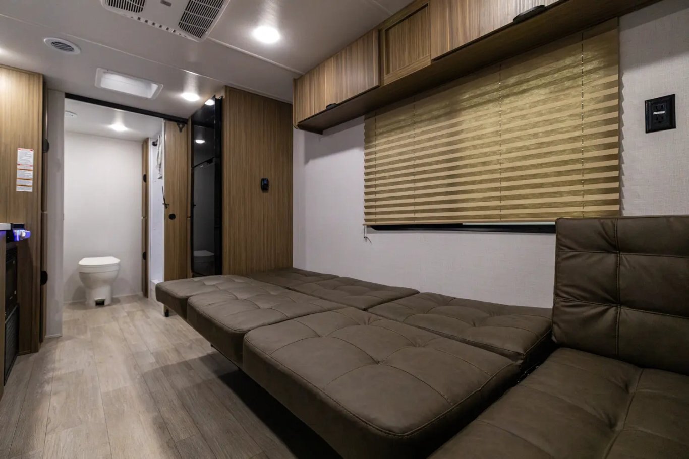 Standard Features: Waterproof Portable FM / Bluetooth Speaker System Extra Thick Luxury Vinyl Flooring - NO CARPET! Largest in Class Opening Panoramic Windows Large 36x24 Shower Pan w/ Shower Surround + Waterproof Retractable Shower Door (No Curtain) Extra Large Holding Tanks for Extended Camping - 75% Larger Than Average! 26" Entrance Doors w/ Friction Hinge to Shut Slow 7-Way Plug and Chain Holder for Towing Ease 4 - 6 USB Ports w/ USB A and USB C Compatibility for Phone and Tablet Charging Large Baggage Doors for Exterior Storage Residential High Rise Kitchen Faucet Backup Camera Ready (Harness and Wiring Installed) 30 Amp Service w/ Auto Detect Converter (Works with Multiple Battery Types) 13.5K BTU Roof Mounted Air Conditioner 20K BTU Furnace Microwave in Kitchen 60,000BTU Extra Large On Demand Hot Water Heater 2 Burner Cook Top with Glass Cover Mirrored Vanity with Medicine Cabinet (available on most models) Omni Directional Digital TV Antenna Water Heater By-Pass Roof Mounted Solar Inlet on Roof Side Mounted Solar Inlet on Camp Side