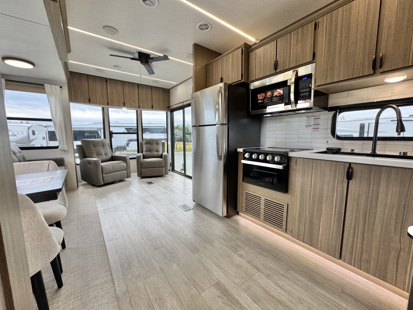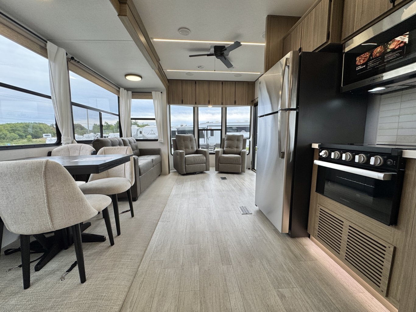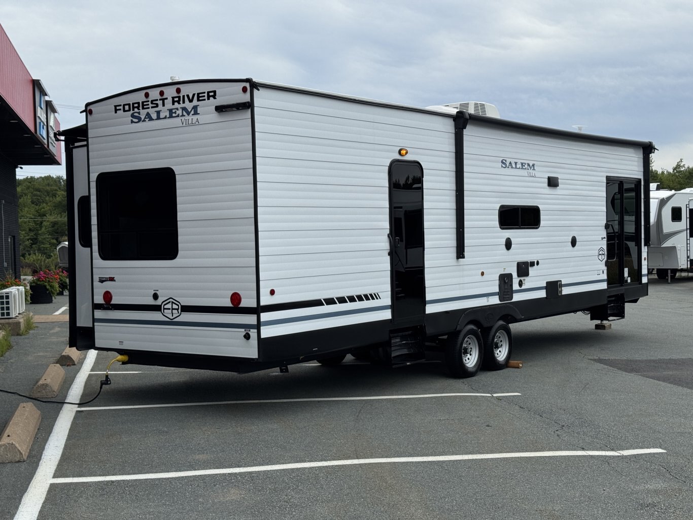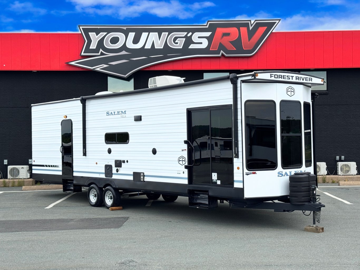 | The Salem Villa 353FLB is the perfect destination trailer for making memories! The rear king bedroom provides plenty of space to stretch out, plus loads of storage space, while the adjacent bathroom gives you a linen closet and walk-in shower with a built-in seat. The large kitchen area includes a stove top plus oven, a residential refrigerator, and farmhouse sink. The living area has both theater seating and sofa with panoramic windows for great campsite views. |