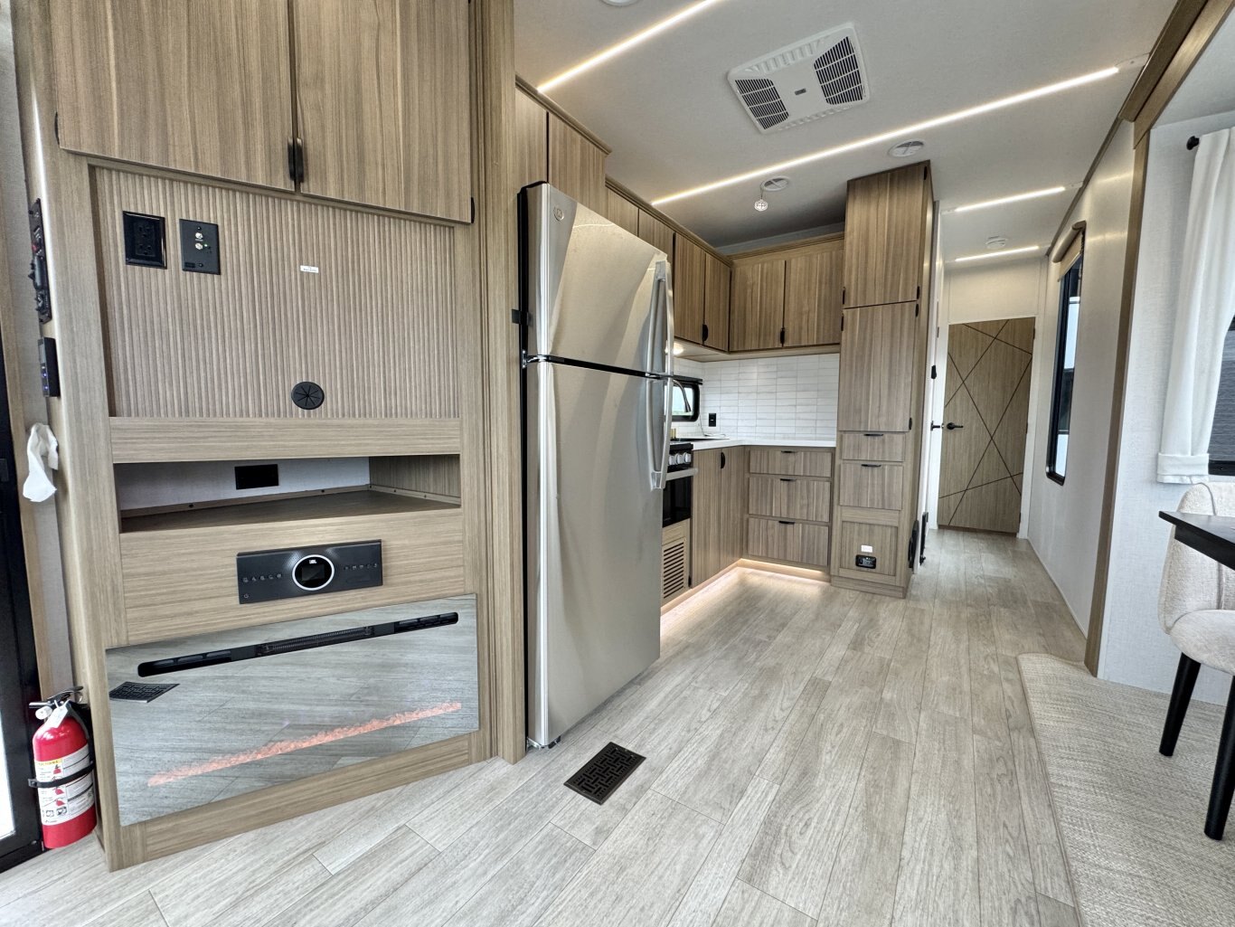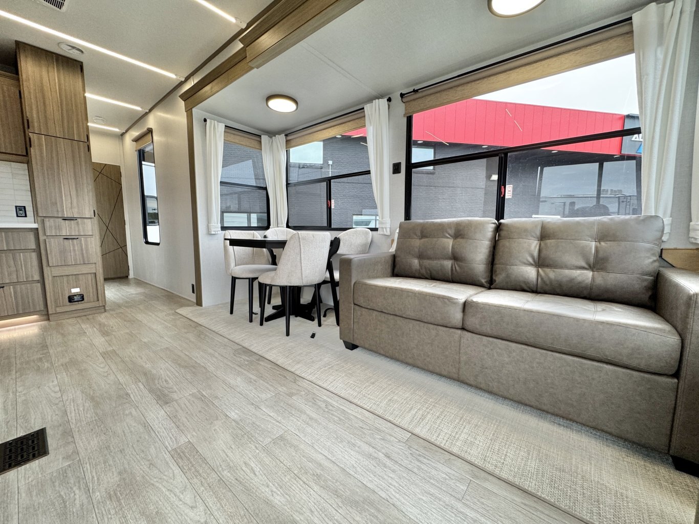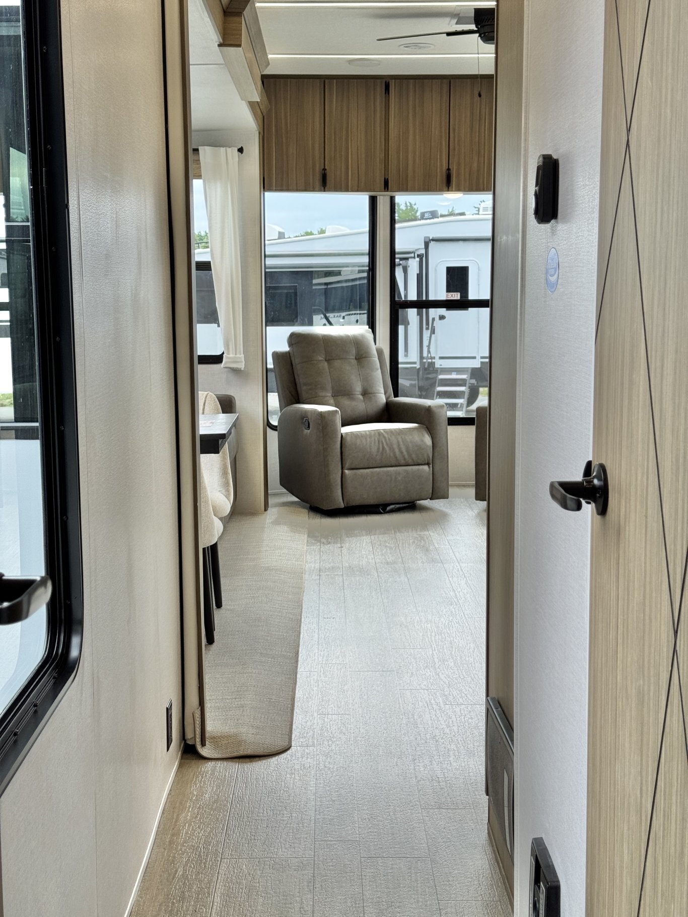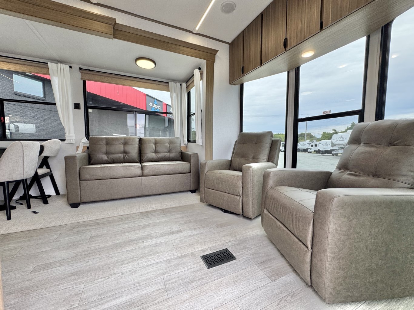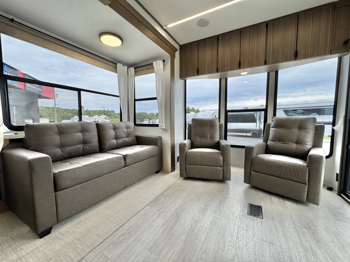 | The Salem Villa 353FLB is the perfect destination trailer for making memories! The rear king bedroom provides plenty of space to stretch out, plus loads of storage space, while the adjacent bathroom gives you a linen closet and walk-in shower with a built-in seat. The large kitchen area includes a stove top plus oven, a residential refrigerator, and farmhouse sink. The living area has both theater seating and sofa with panoramic windows for great campsite views. |