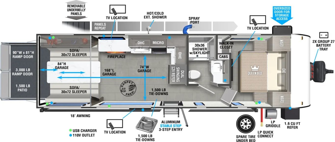 • MAX COLD WEATHER Package: 12V Heated Tank Pads on all Holding Tanks (Fresh, Grey, and Black) w/ AutoStart below 48°F + Fully Enclosed Underbelly Using Industry Leading AccessiBelly Panels + Insulated Flooring for Heat Capture and Deflection