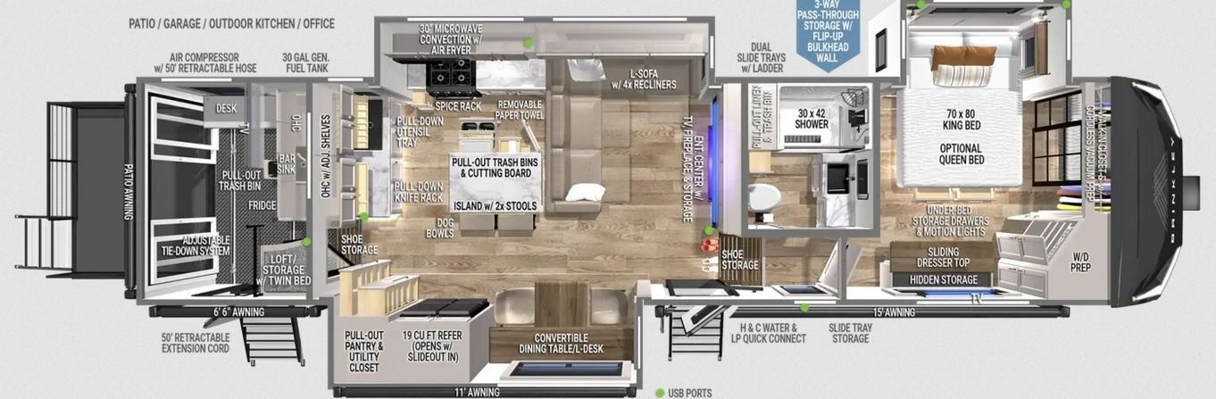 • Maximum Exterior Storage: Massive 3-Way Pass-through Storage with Slide Trays