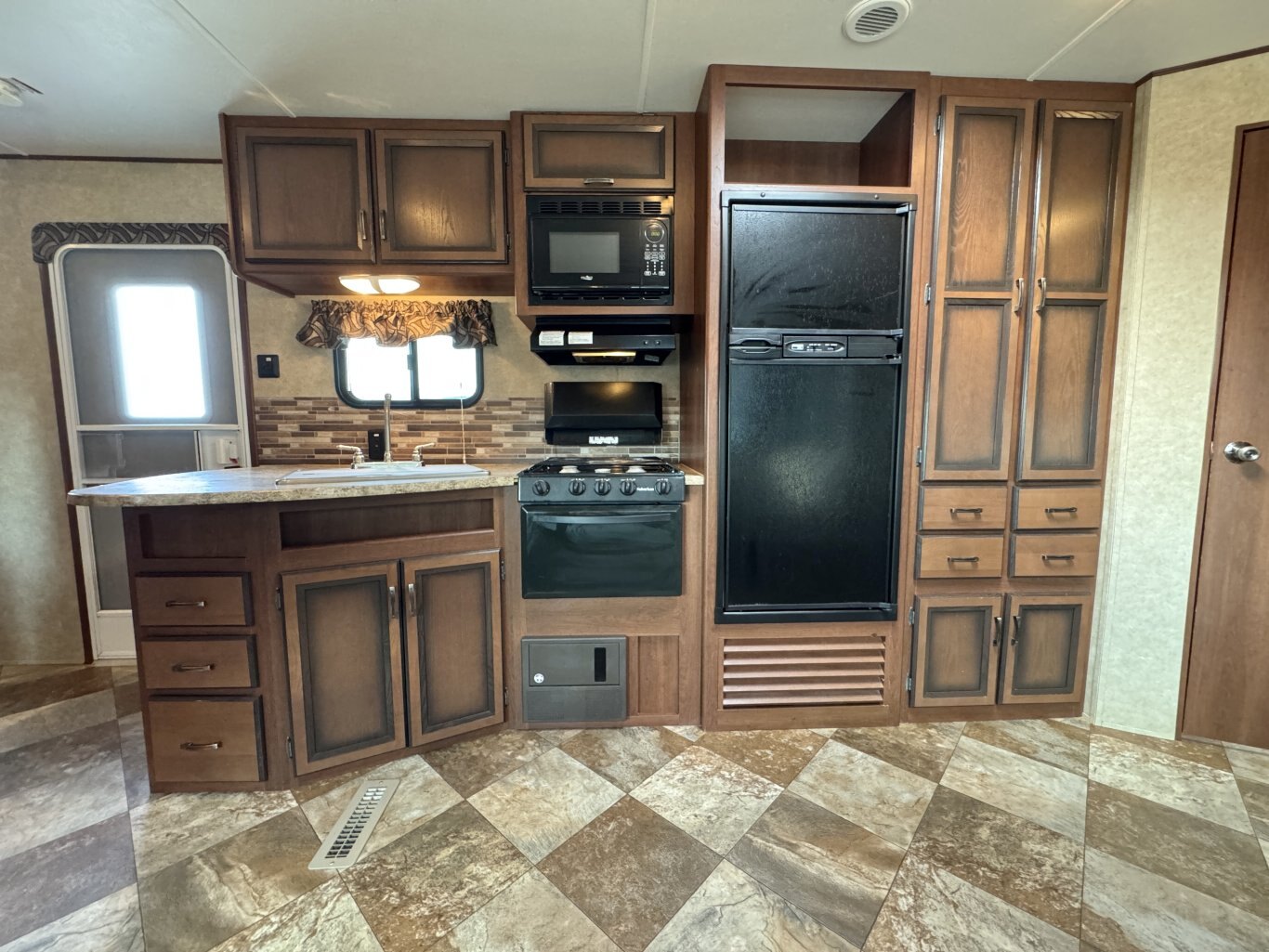 Kitchen: 3-burner stove, oven, microwave, midsize fridge