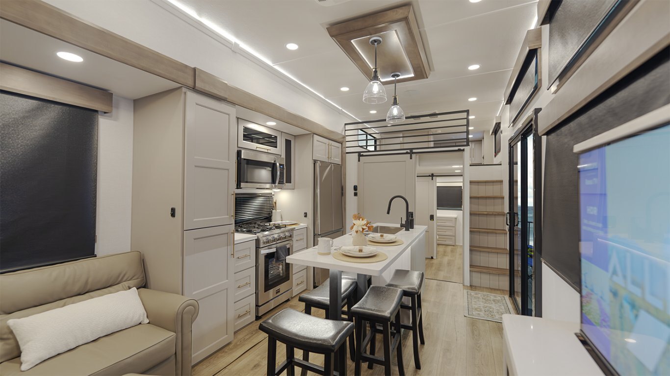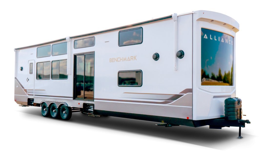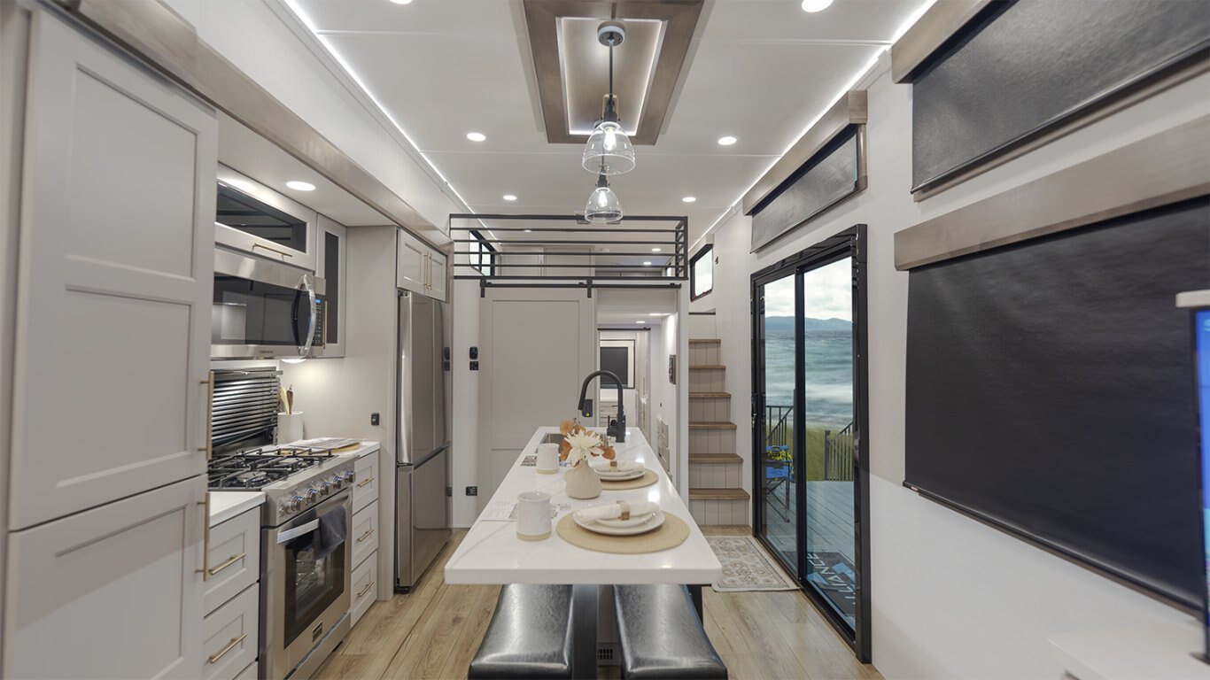 The Benchmark 44LOFT redefines family luxury on the road with its one-of-a-kind dual loft layout, ideal for large families or multi-generational living. With two private lofts—one in the front and one in the rear—each outfitted with dedicated beds, TVs, and storage, everyone gets their own retreat. The main floor balances comfort and function, featuring a large L-shaped sofa, fireplace, 50" TV, full kitchen with island, and dual-entry dining area. A residential king suite with tilt bed and in-suite bath provides a premium master experience, while the second full bathroom supports life on the go. Thoughtful details like dual 19' awnings, two fireplaces, and a sliding patio door elevate the 44LOFT into a truly residential living space—anywhere you park it.
