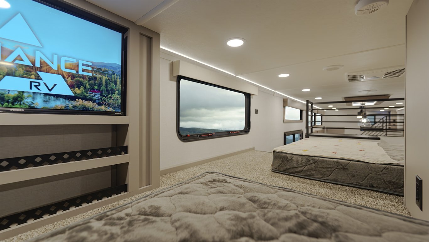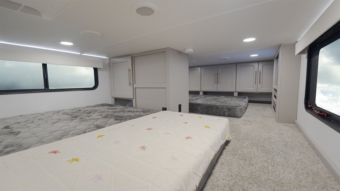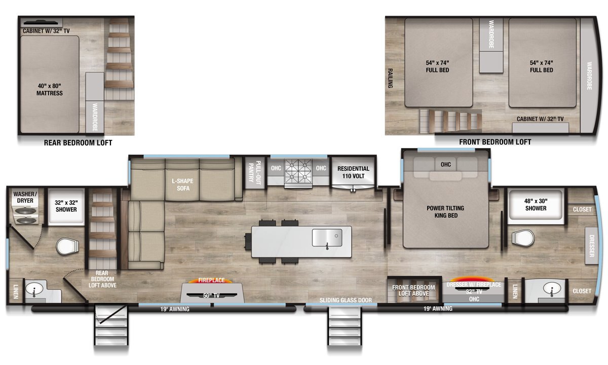 - Dual loft design features a rear loft with a 40" x 80" mattress, wardrobe, and 32" TV, and a front loft with two full-size 54" x 74" beds, wardrobes, and a second 32" TV