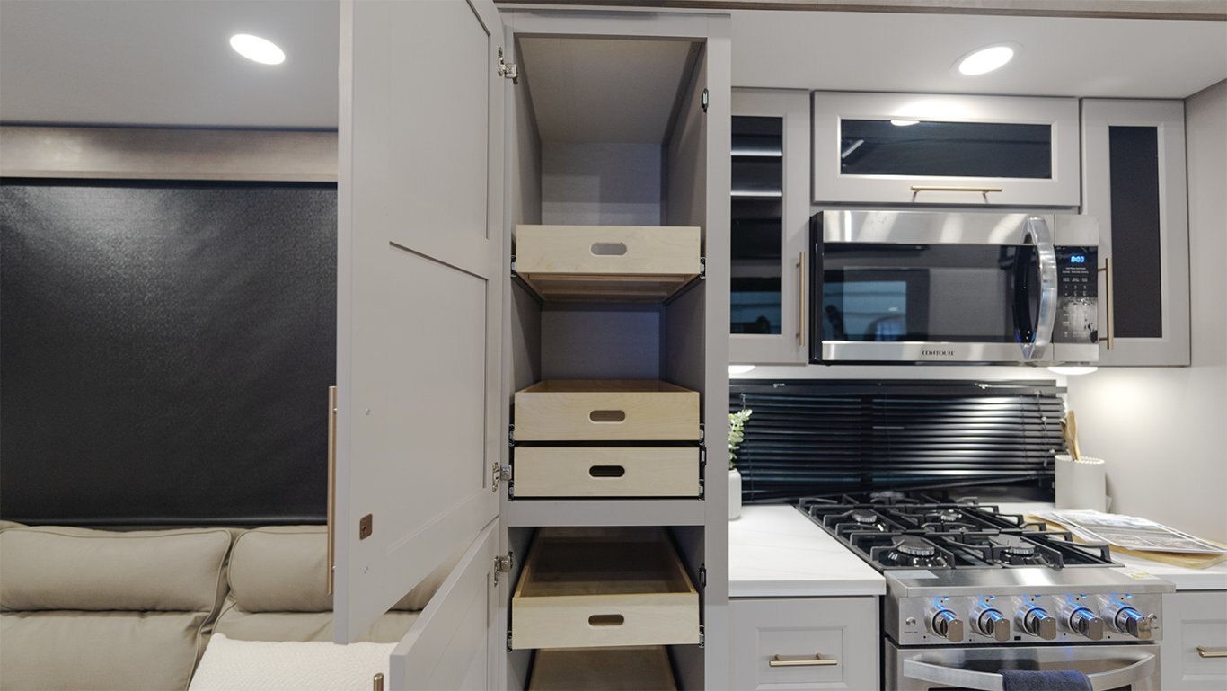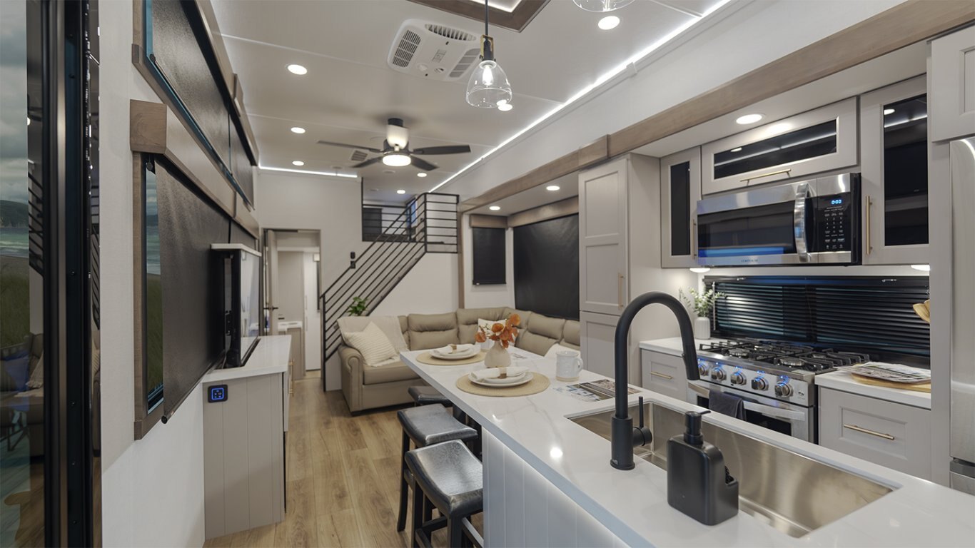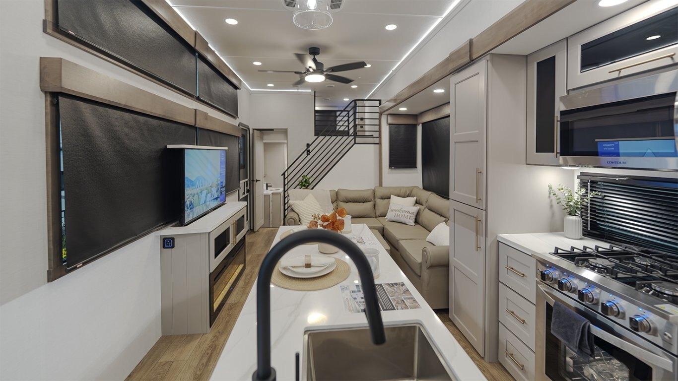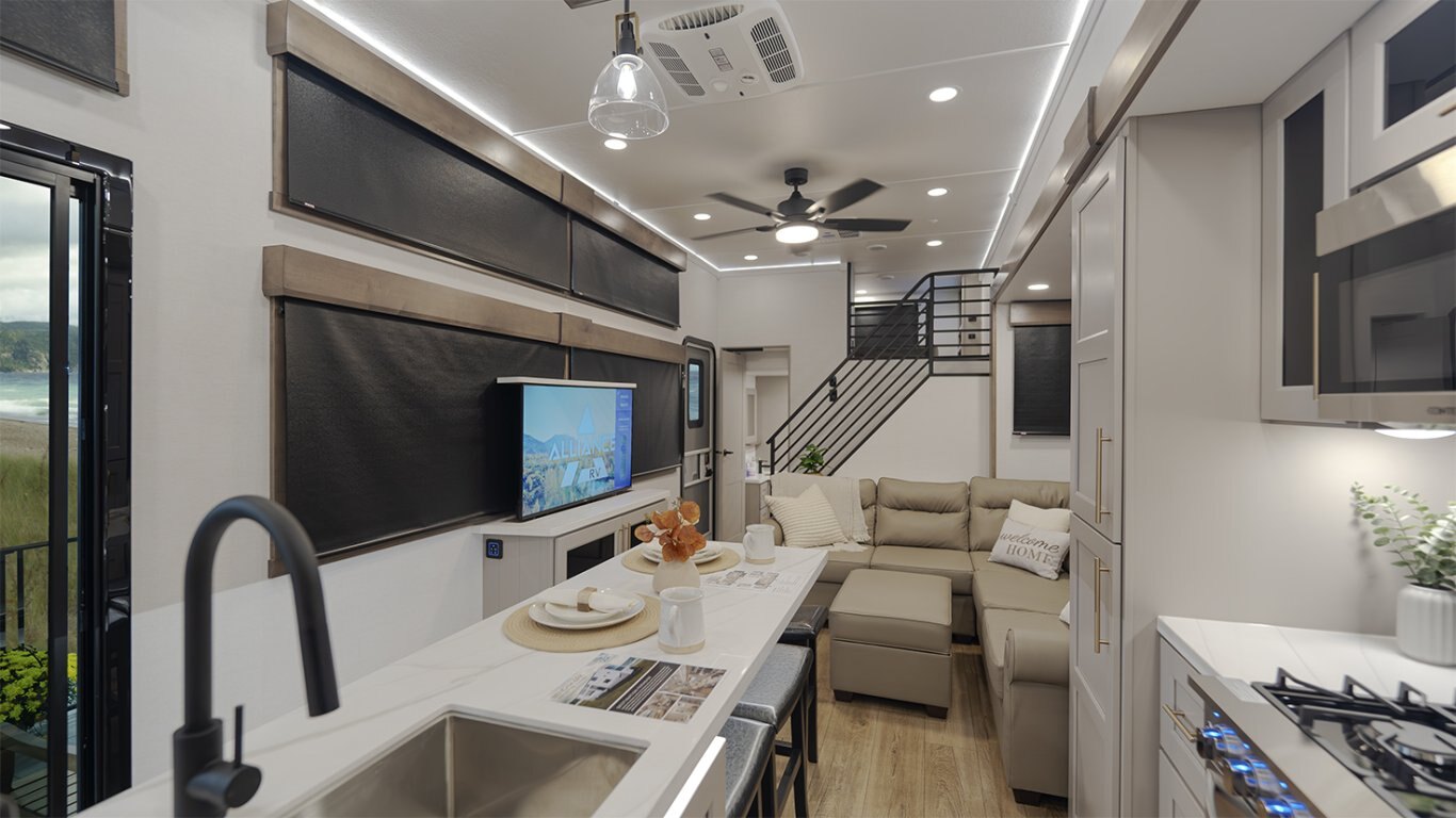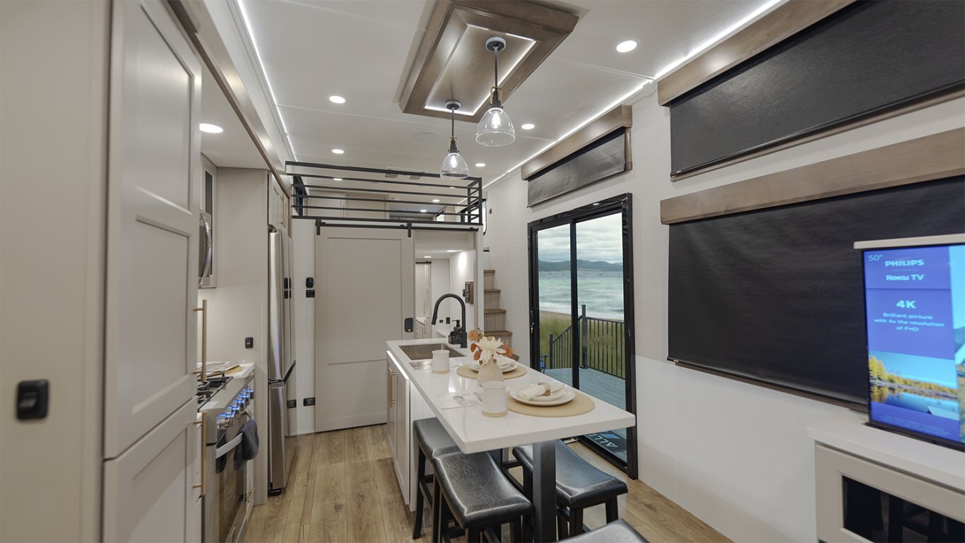- Main living area showcases an L-shaped sofa, 50" TV, fireplace, freestanding dinette, pull-out pantry, and residential 110V fridge