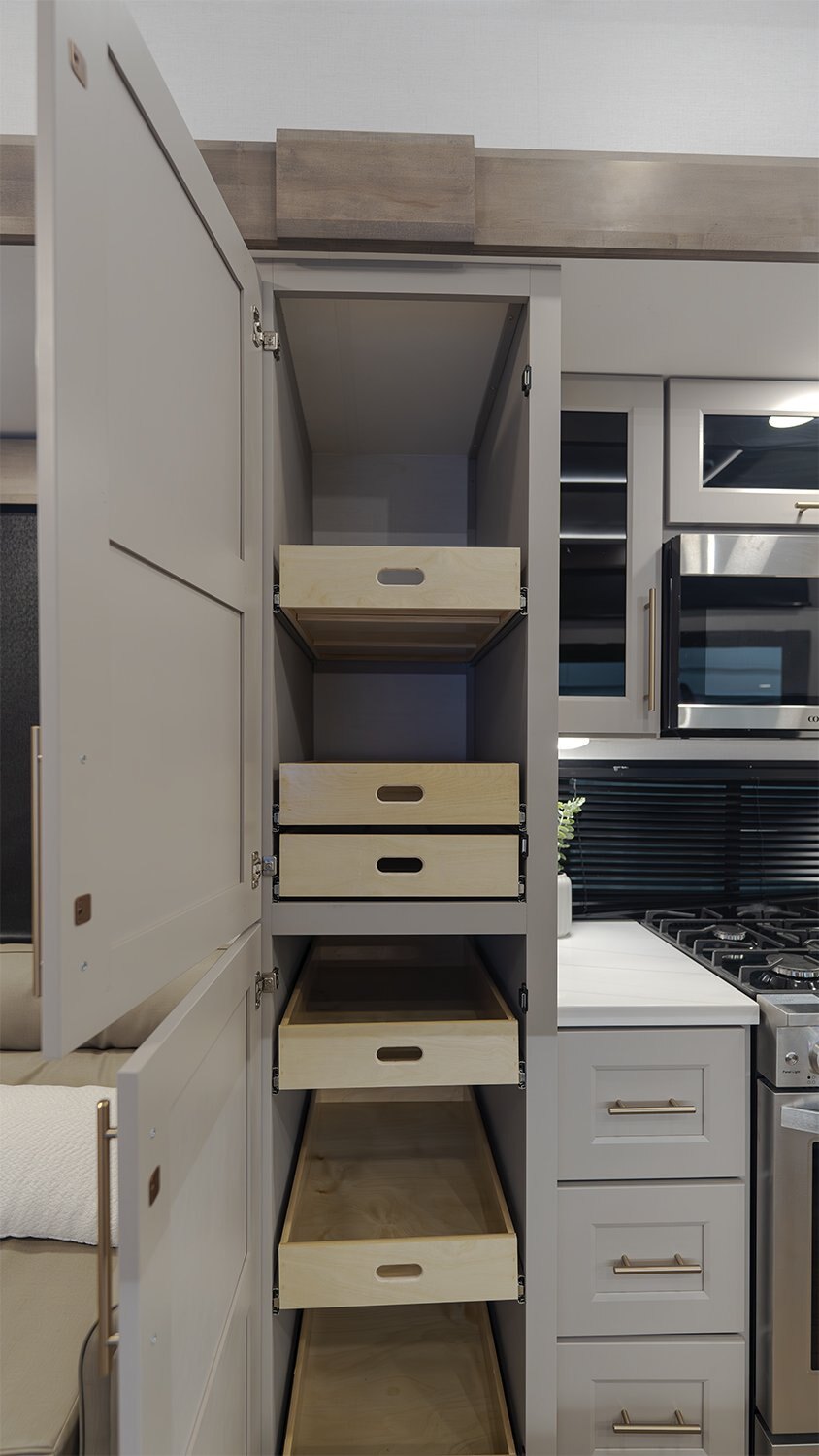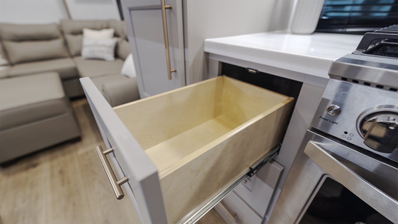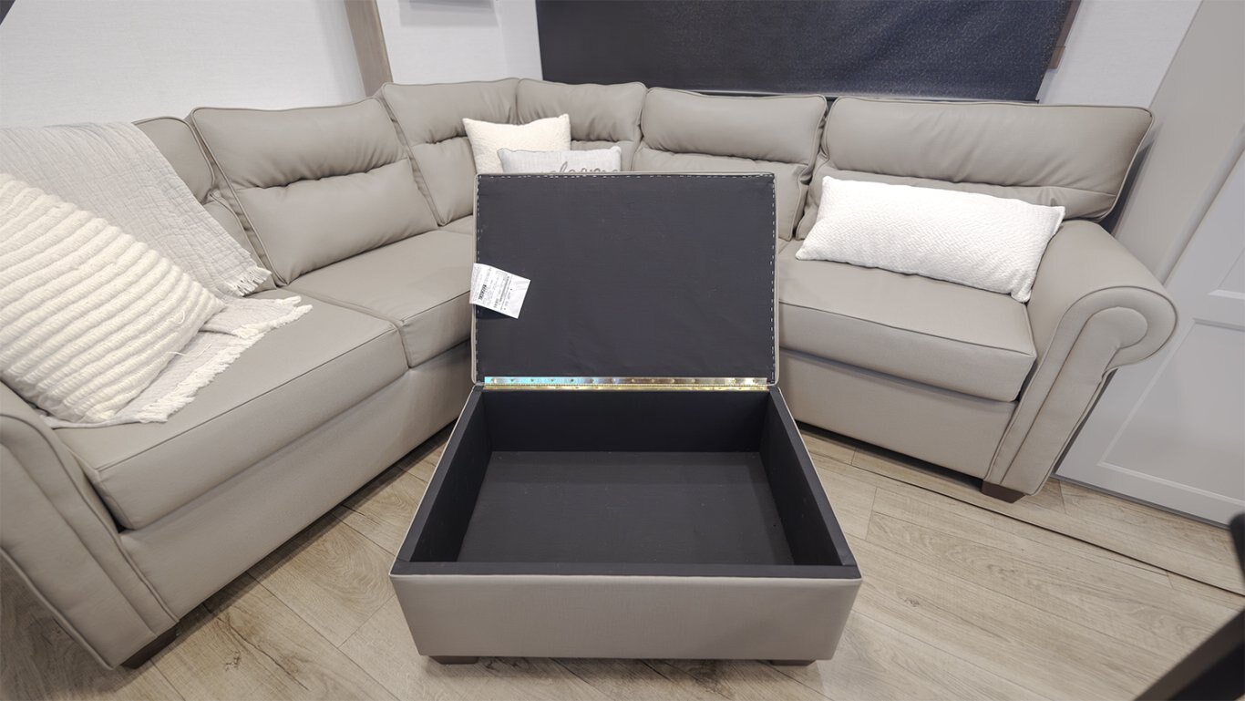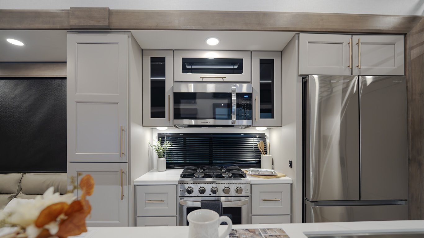 - Main living area showcases an L-shaped sofa, 50" TV, fireplace, freestanding dinette, pull-out pantry, and residential 110V fridge