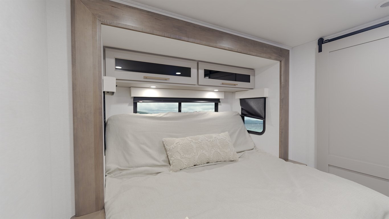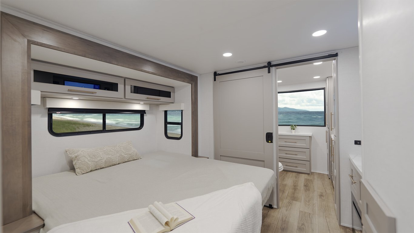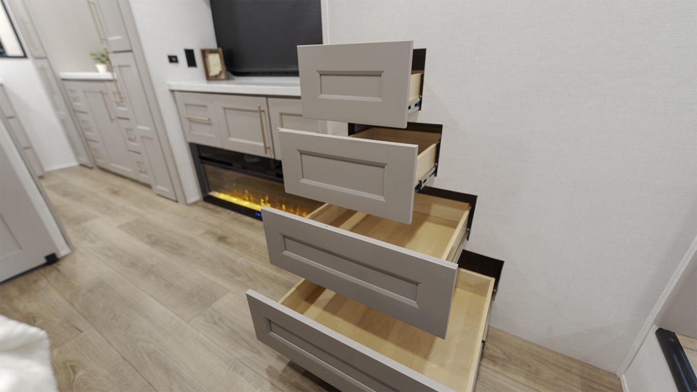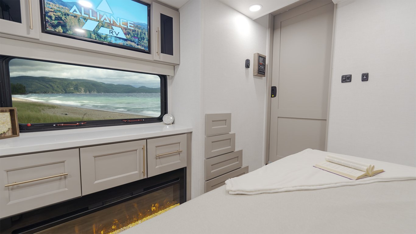 - Front bedroom offers a 72" x 80" power tilting king bed, dresser with fireplace and 32" TV, and private access to the second full bath