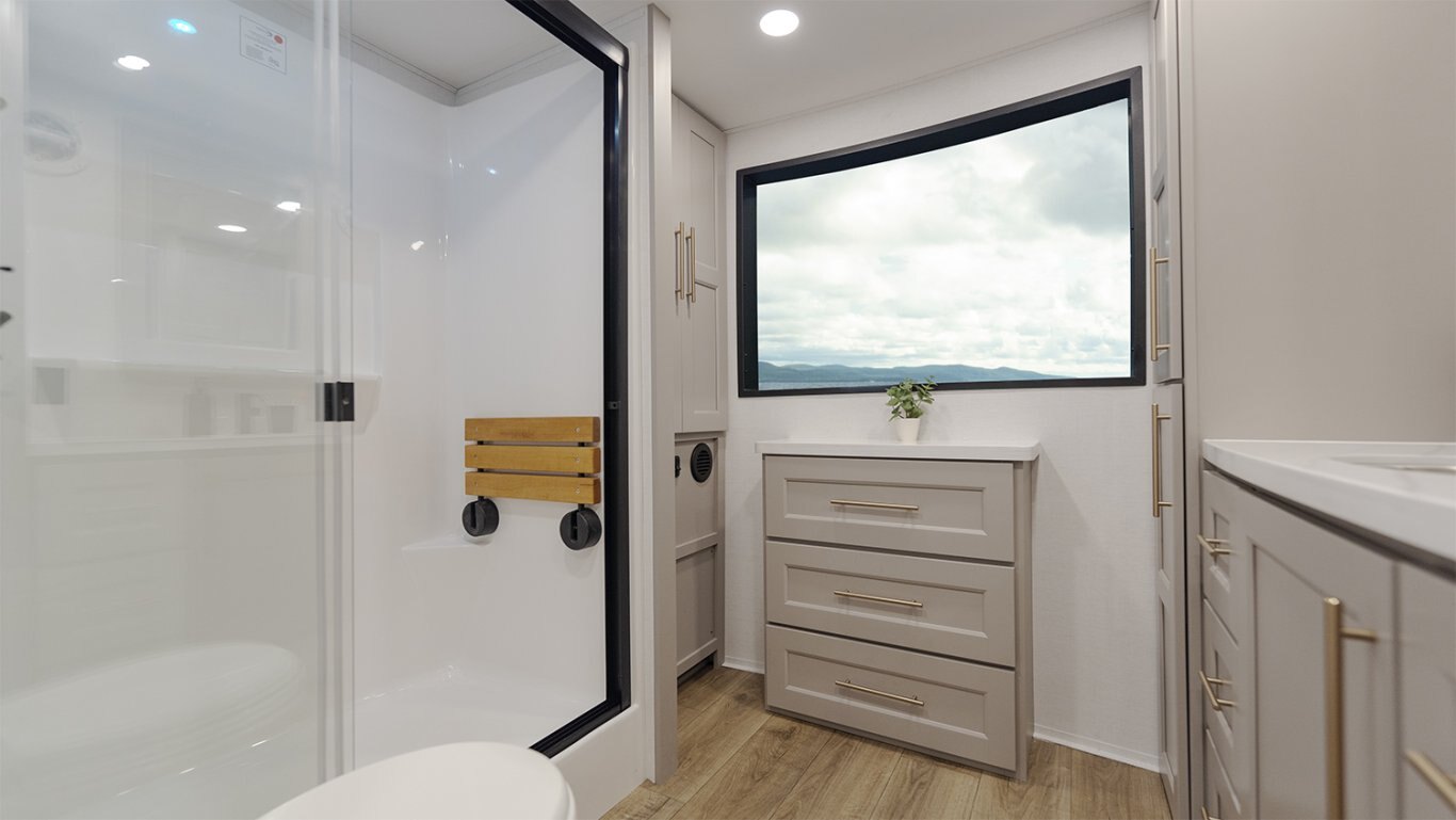 - Rear bathroom includes a 32" x 32" shower, washer/dryer, linen closet, and direct access to the rear loft staircase