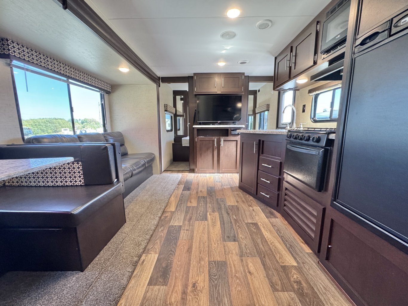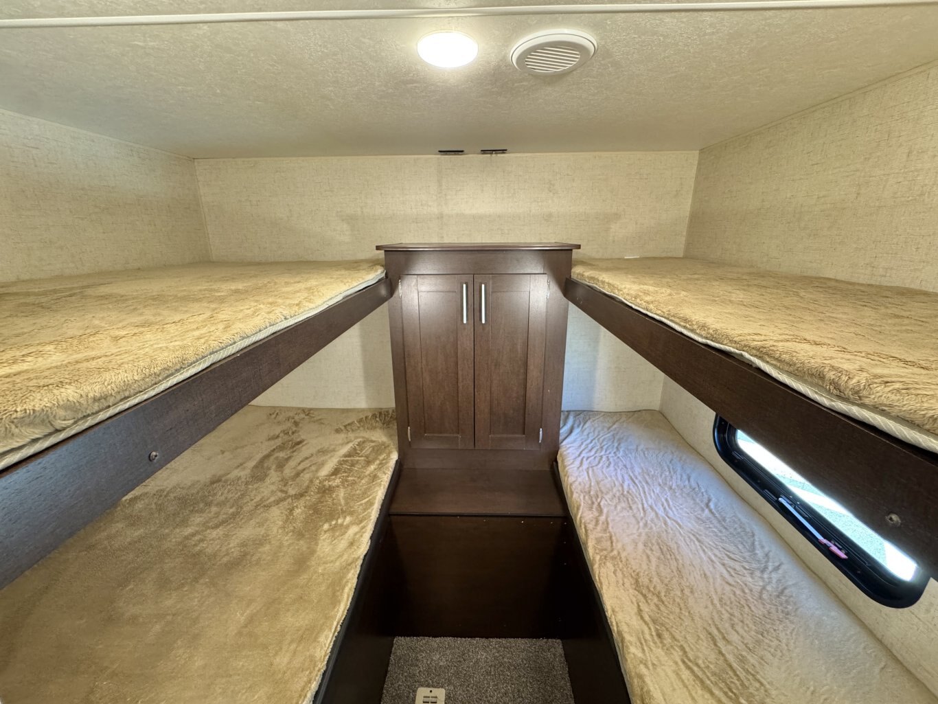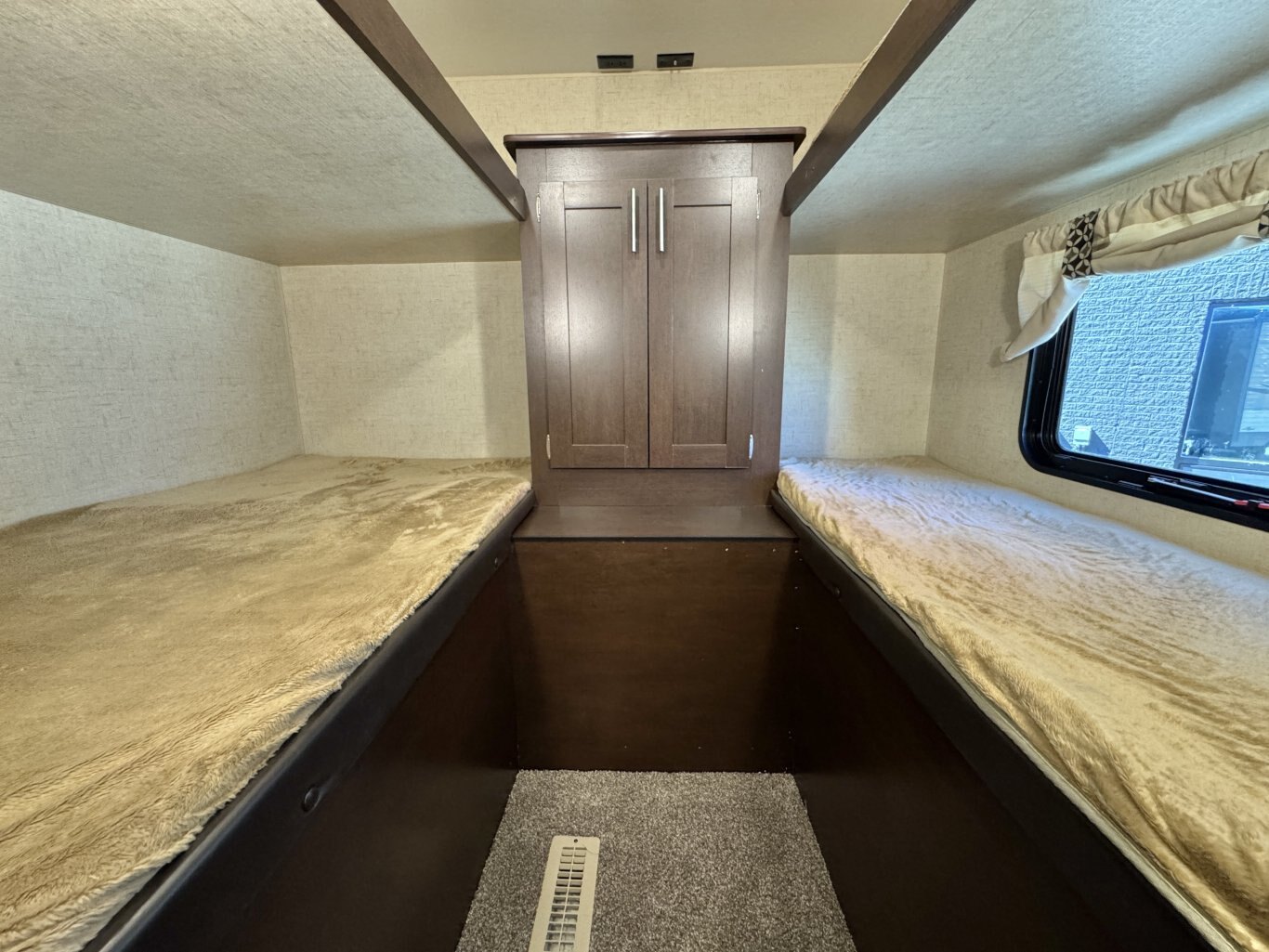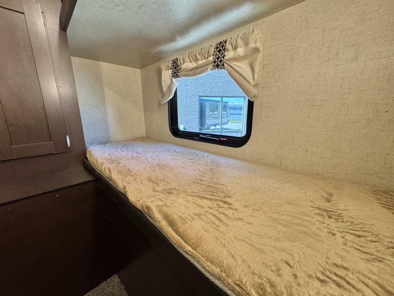 This 32′ 8″ family bunkhouse trailer sleeps up to 10, featuring a front queen bedroom, four rear bunks, plus convertible dinette and sofa beds. A single slide-out opens up the interior, now enhanced with a slide topper to shield the slide and boost its durability. At 6,100 lb dry weight with an 8,000 lb GVWR, it’s solid yet towable. Onboard comforts include a full center kitchen, rear bathroom, 16′ power awning with LED light, dual propane tanks, and a mid-size fridge—all designed to make family camping both spacious and comfortable.