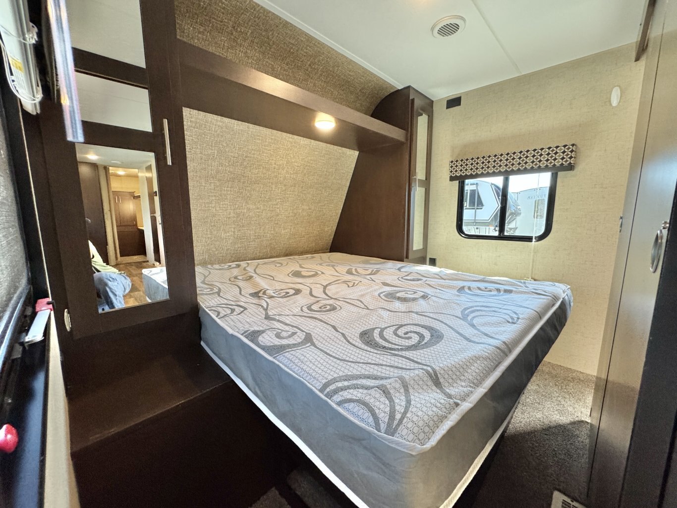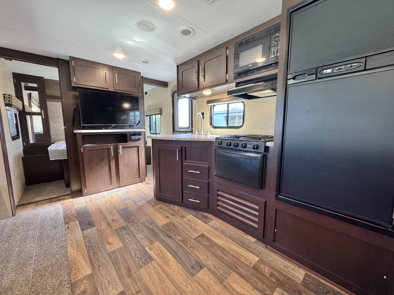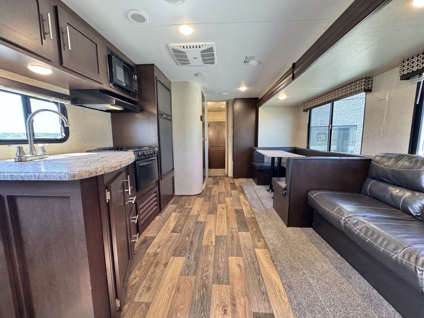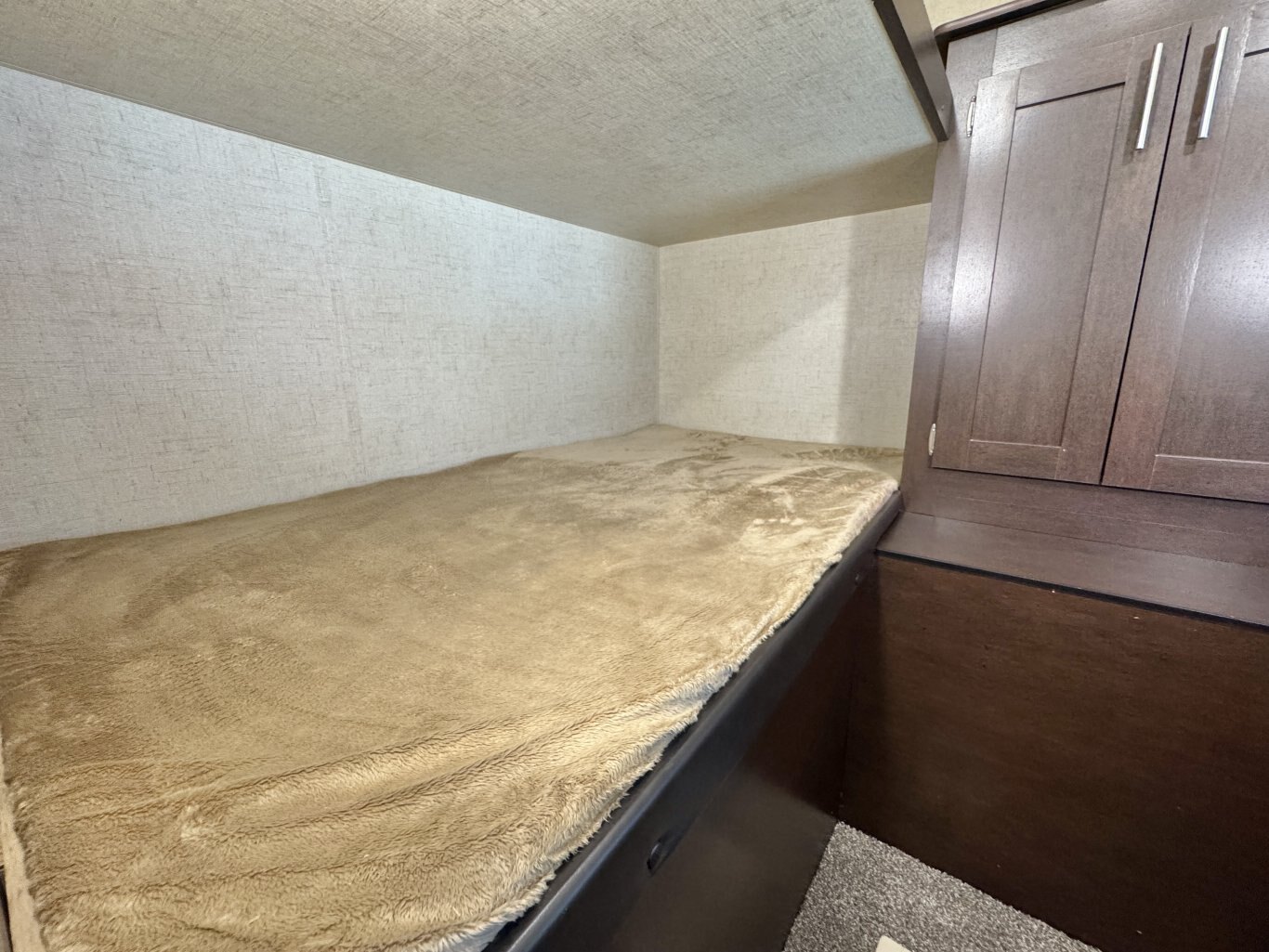 This 32′ 8″ family bunkhouse trailer sleeps up to 10, featuring a front queen bedroom, four rear bunks, plus convertible dinette and sofa beds. A single slide-out opens up the interior, now enhanced with a slide topper to shield the slide and boost its durability. At 6,100 lb dry weight with an 8,000 lb GVWR, it’s solid yet towable. Onboard comforts include a full center kitchen, rear bathroom, 16′ power awning with LED light, dual propane tanks, and a mid-size fridge—all designed to make family camping both spacious and comfortable.