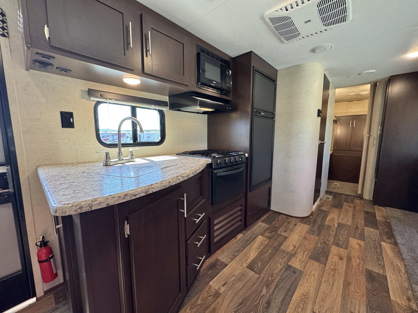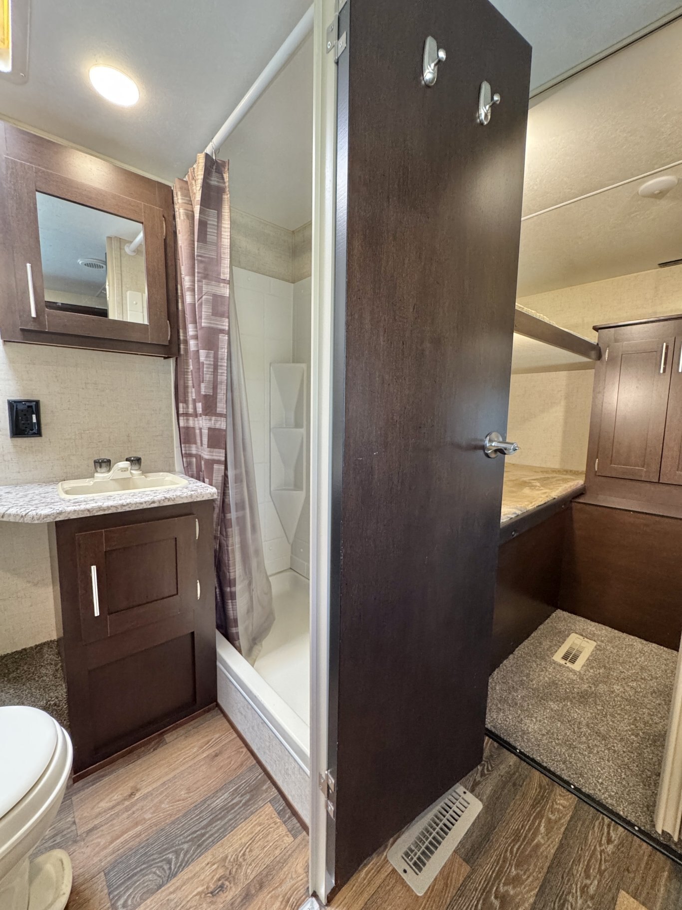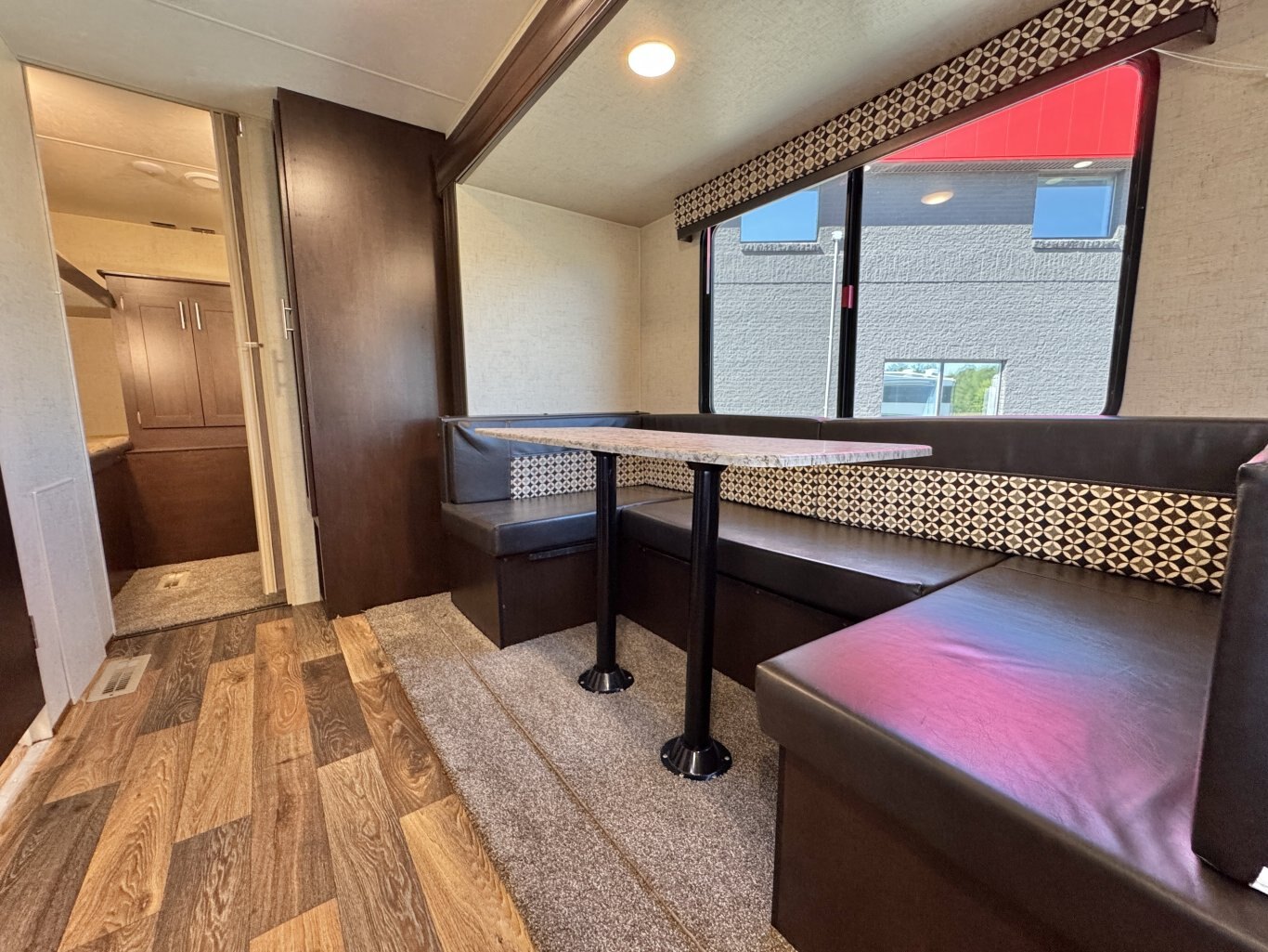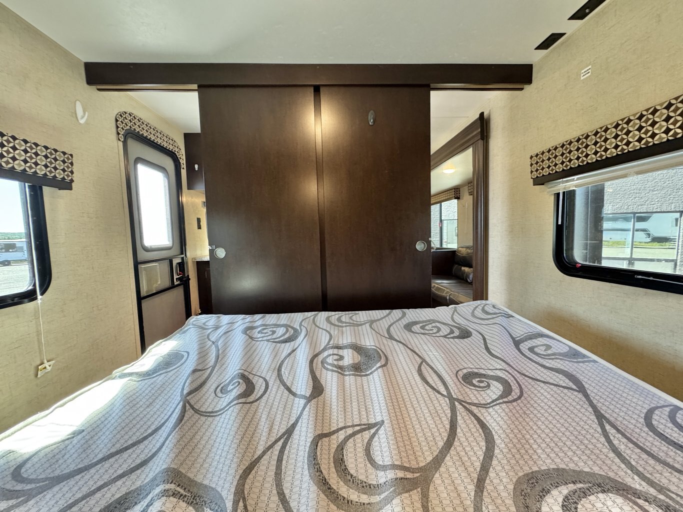 This 32′ 8″ family bunkhouse trailer sleeps up to 10, featuring a front queen bedroom, four rear bunks, plus convertible dinette and sofa beds. A single slide-out opens up the interior, now enhanced with a slide topper to shield the slide and boost its durability. At 6,100 lb dry weight with an 8,000 lb GVWR, it’s solid yet towable. Onboard comforts include a full center kitchen, rear bathroom, 16′ power awning with LED light, dual propane tanks, and a mid-size fridge—all designed to make family camping both spacious and comfortable.