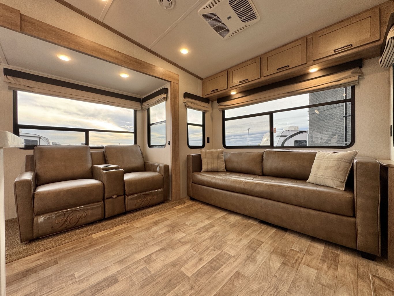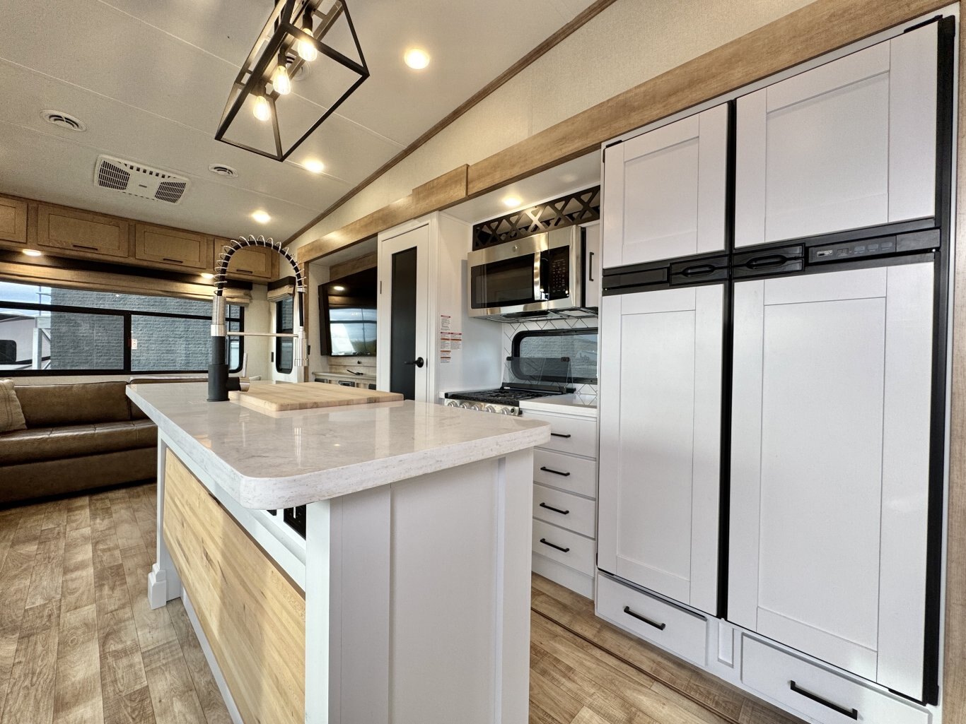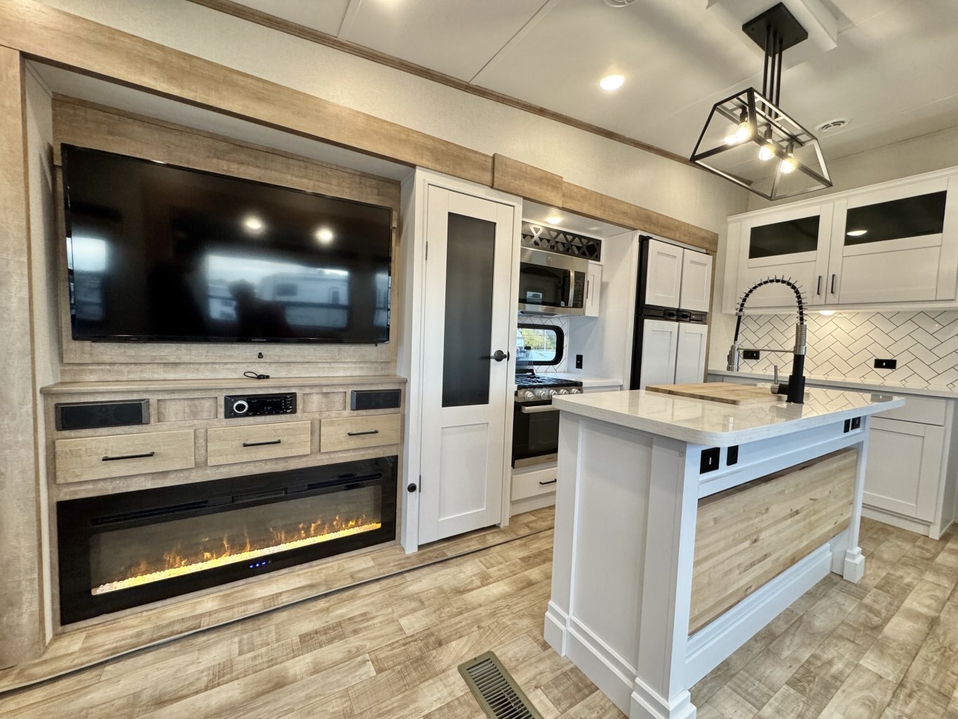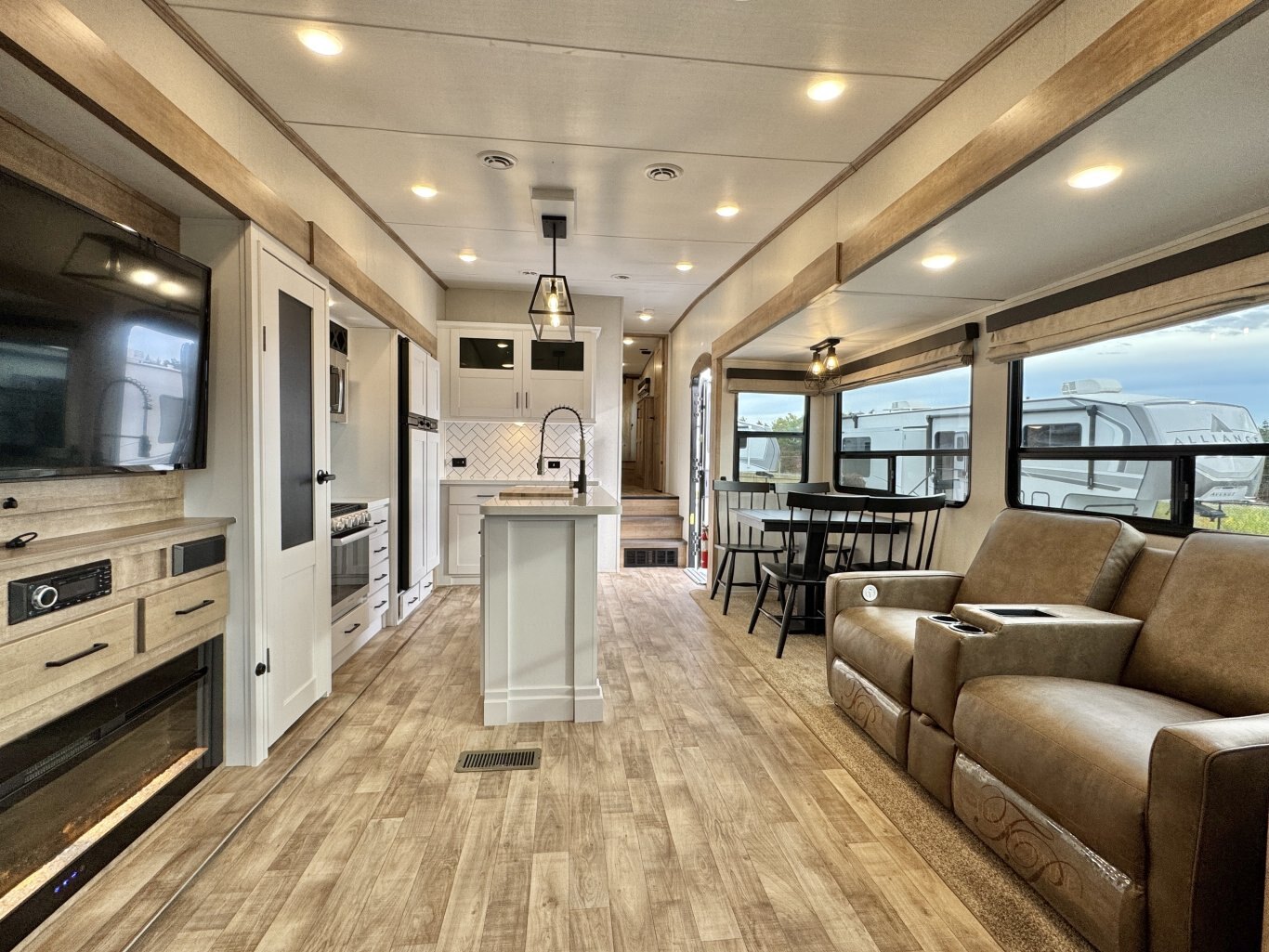 This 38′6″ fifth wheel balances luxury and functionality, sleeping up to 4 adults. Its bright and open rear-living room includes theatre seating, a fireplace, and panoramic windows. A central kitchen comes loaded with high-end appliances and a large island. The bathroom sits between the living area and the private front bedroom, which features a king bed, a washing machine, and ample storage. With solid insulation, and quality construction, the Arcadia offers a refined, year-round retreat on wheels.