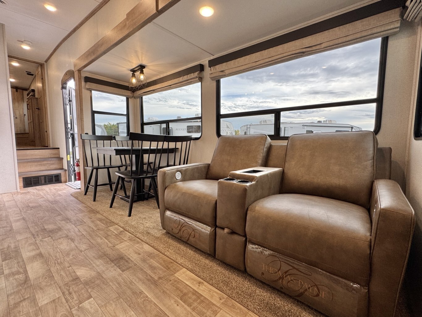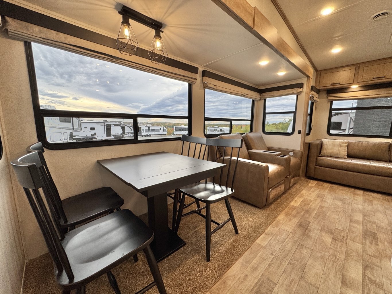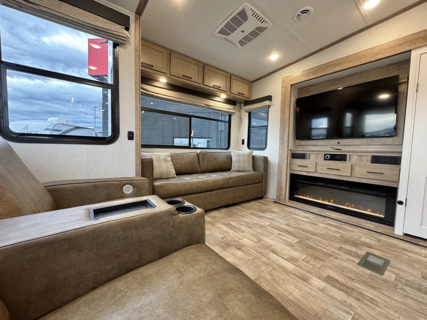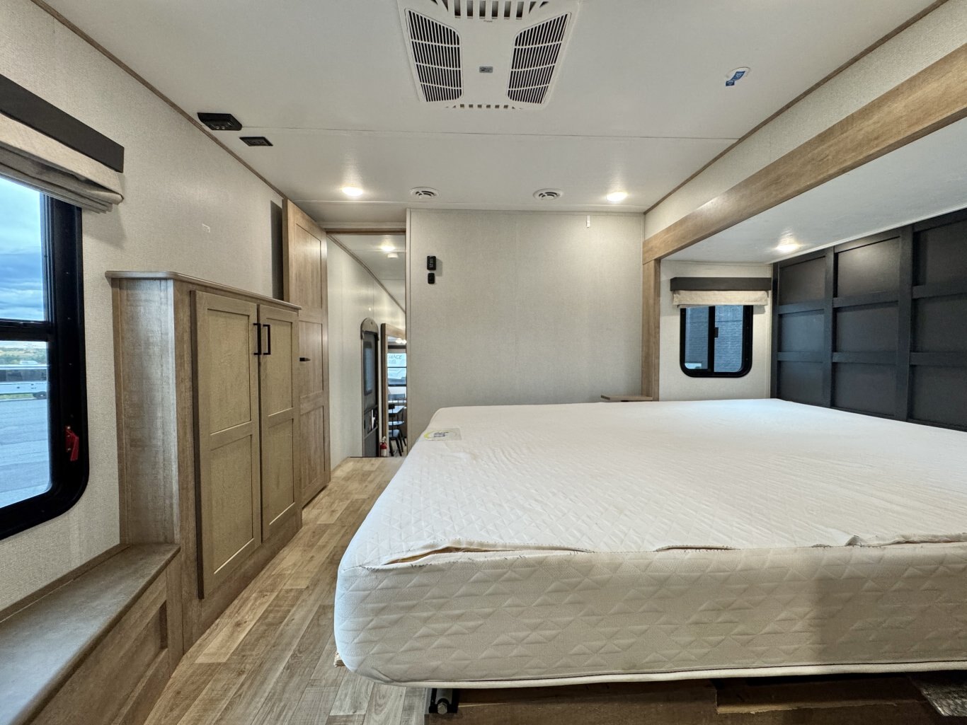 This 38′6″ fifth wheel balances luxury and functionality, sleeping up to 4 adults. Its bright and open rear-living room includes theatre seating, a fireplace, and panoramic windows. A central kitchen comes loaded with high-end appliances and a large island. The bathroom sits between the living area and the private front bedroom, which features a king bed, a washing machine, and ample storage. With solid insulation, and quality construction, the Arcadia offers a refined, year-round retreat on wheels.