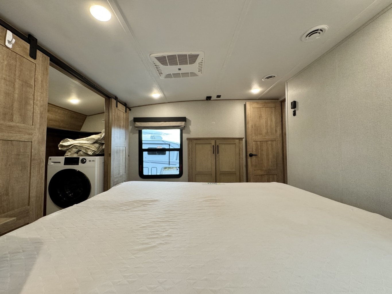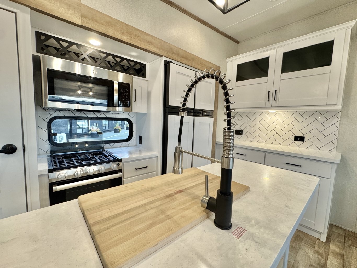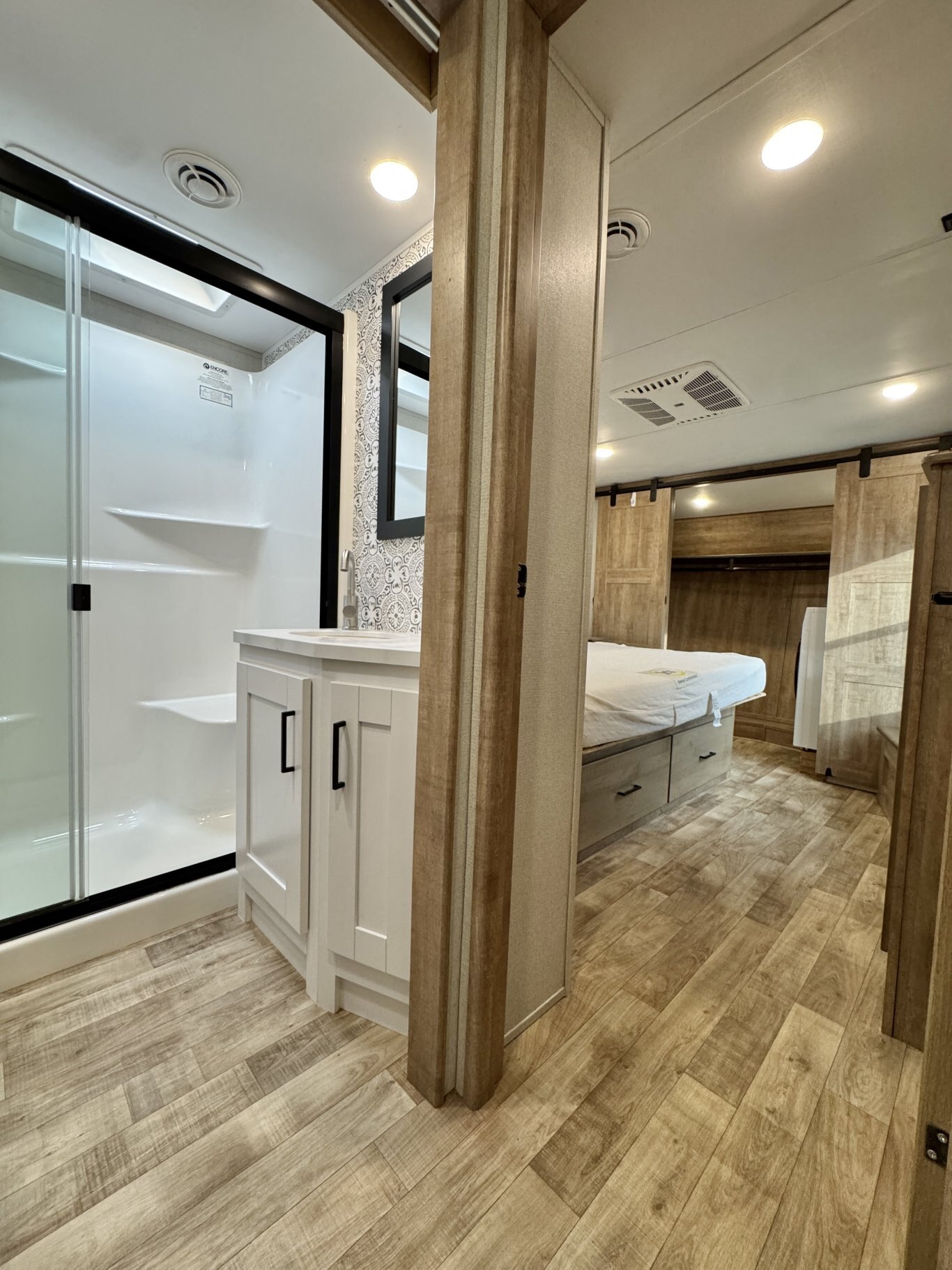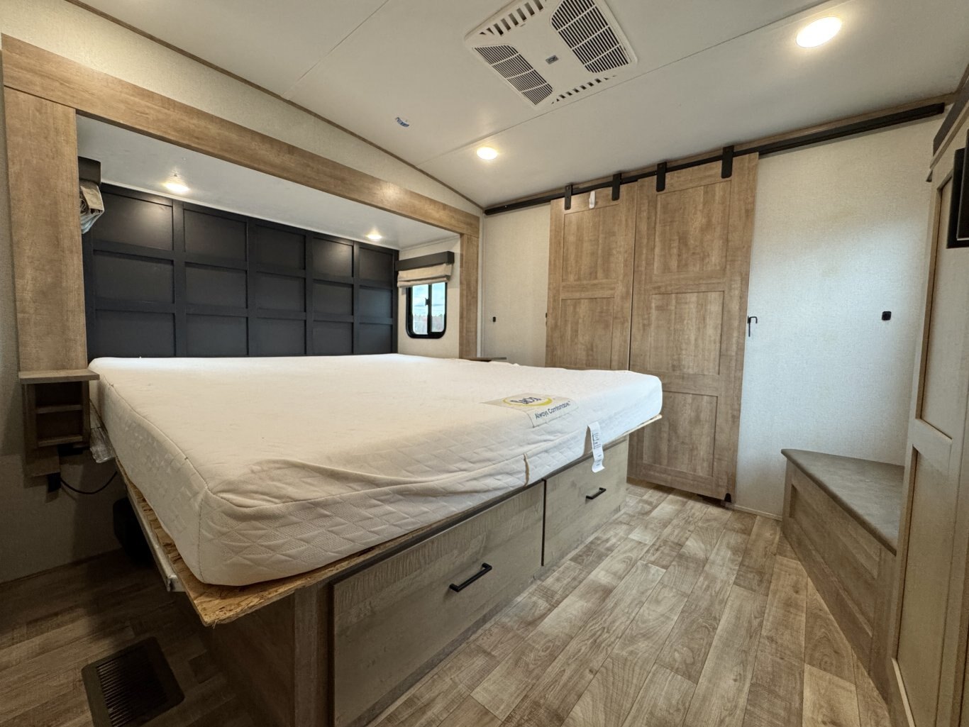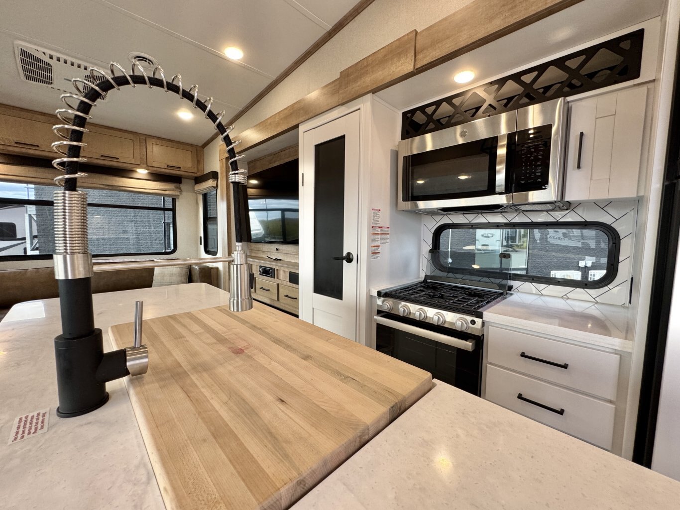 This 38′6″ fifth wheel balances luxury and functionality, sleeping up to 4 adults. Its bright and open rear-living room includes theatre seating, a fireplace, and panoramic windows. A central kitchen comes loaded with high-end appliances and a large island. The bathroom sits between the living area and the private front bedroom, which features a king bed, a washing machine, and ample storage. With solid insulation, and quality construction, the Arcadia offers a refined, year-round retreat on wheels.