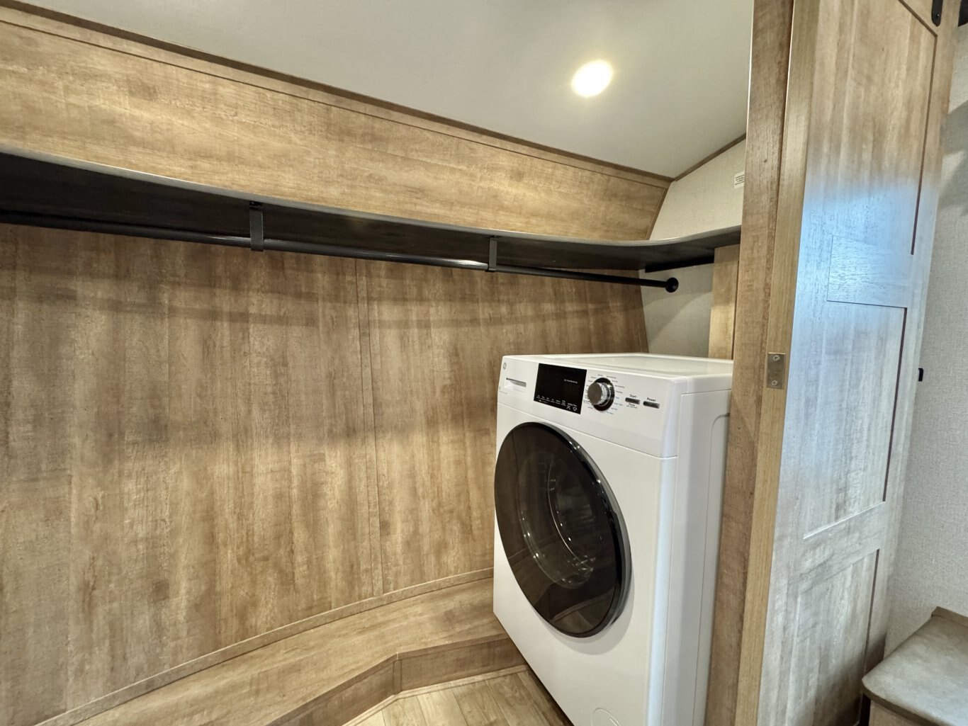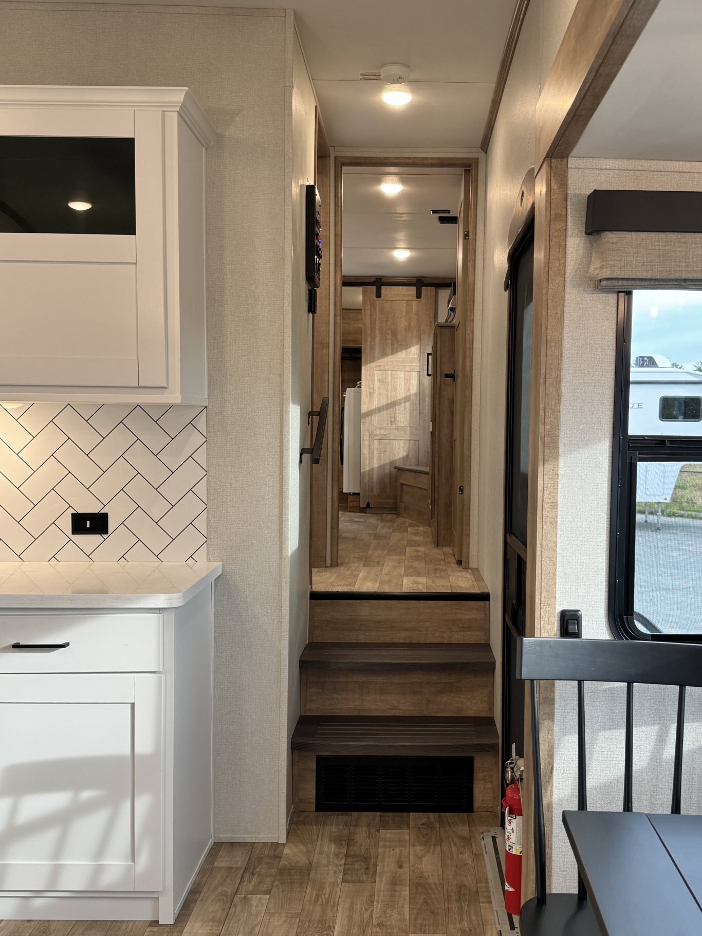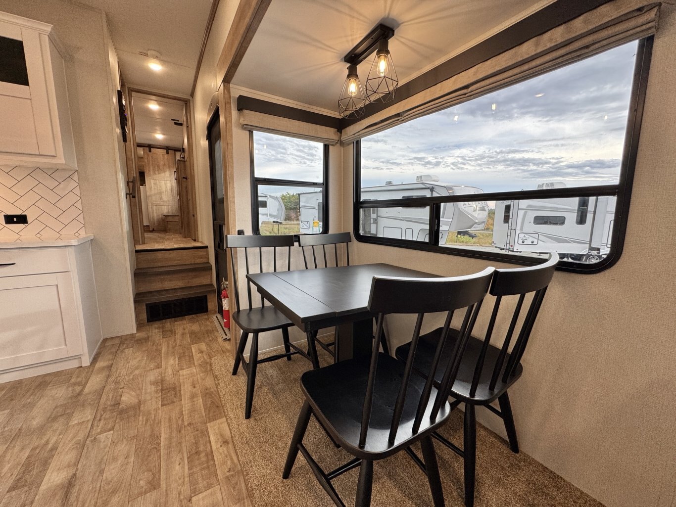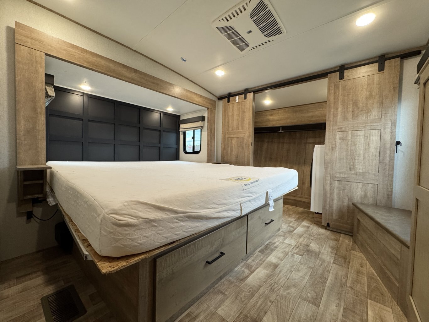 This 38′6″ fifth wheel balances luxury and functionality, sleeping up to 4 adults. Its bright and open rear-living room includes theatre seating, a fireplace, and panoramic windows. A central kitchen comes loaded with high-end appliances and a large island. The bathroom sits between the living area and the private front bedroom, which features a king bed, a washing machine, and ample storage. With solid insulation, and quality construction, the Arcadia offers a refined, year-round retreat on wheels.