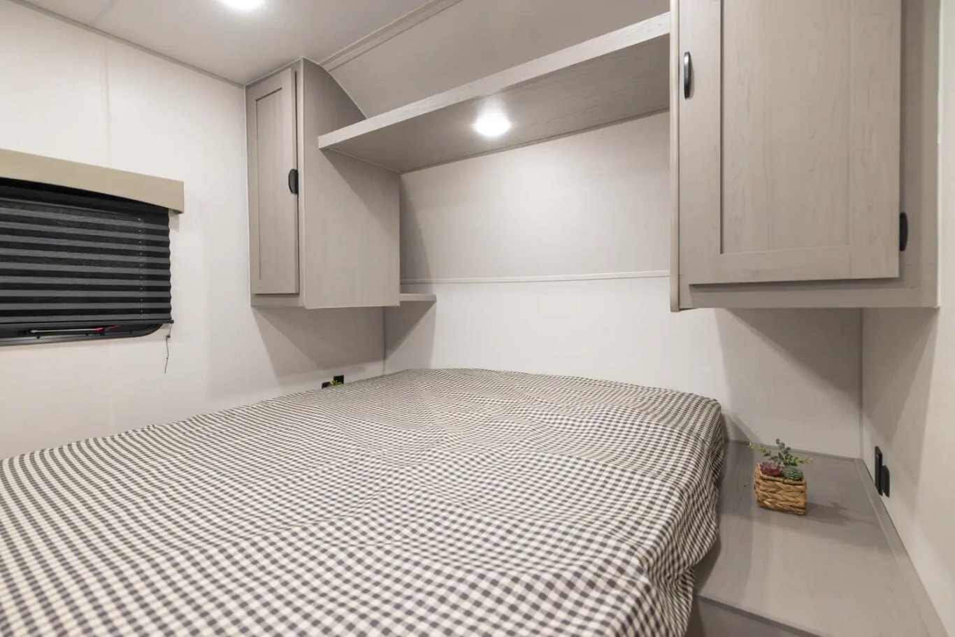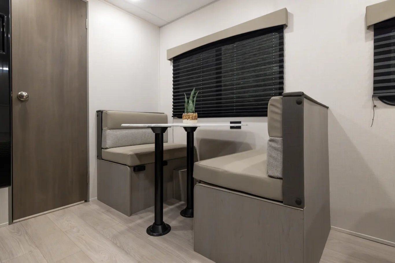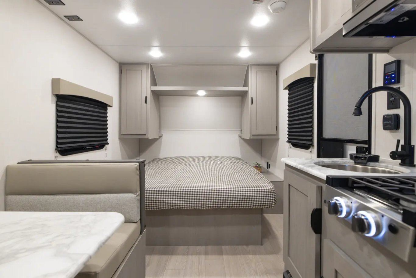 | The most popular 3K Series couples coach in our product lineup, the 17FQ comes with a north/south walk-around bed with both side and over-head storage, 2-seat dinette (that converts into a bed), and a full-width rear bathroom. This camper is perfect for a couple looking for the most functional and spacious under 3000 lb trailer on the market. #CampEasy |
